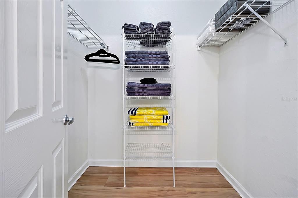 This compact walk-in closet is designed with clean, minimal aesthetics emphasizing organization and functionality. White walls and wire shelving create a bright, open atmosphere, complemented by warm-toned wood flooring adding subtle richness. The closet features multiple metal racks along the walls for hanging garments, while a free-standing shelving unit in the center neatly holds folded towels and linens, predominantly in dark navy and vibrant yellow hues which bring pops of color to the understated space. The simple door with modern hardware finishes off this practical and visually calming storage area.