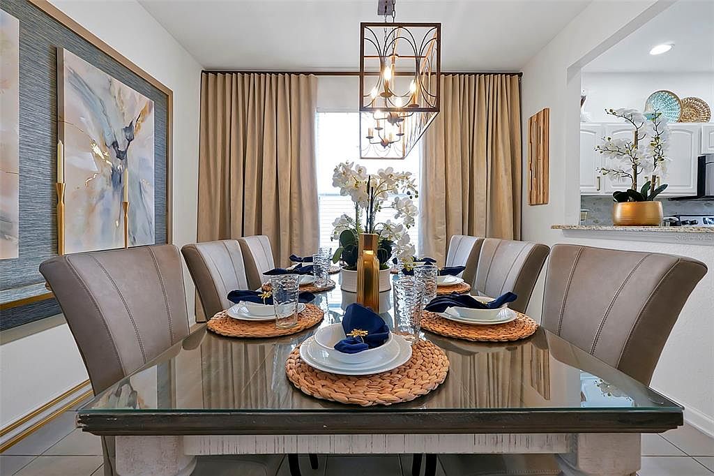 This spacious dining area is centered around a large glass-top table supported by a rustic whitewashed wood base. Eight high-back chairs in smooth taupe upholstery encircle the table, creating a balanced and inviting seating arrangement. Each place setting features woven natural placemats, white dishes, and navy blue cloth napkins with gold napkin rings, lending a sophisticated yet warm contrast. A contemporary rectangular chandelier with geometric metal framing and warm bulbs hangs overhead, providing both light and style. Neutral beige curtains frame the window, complementing the soft tones throughout the room, while abstract art and floral centerpieces add dynamic accents for a polished, elegant aesthetic.