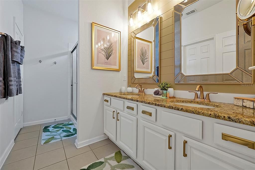 This bathroom features a spacious double vanity with white cabinetry accented by brass handles, complemented by a polished granite countertop in warm, earthy tones. Above the sinks are two decorative mirrors with gold geometric frames that add an elegant touch, mounted against a shiplap wall painted in a soft beige hue for texture. Modern sconces provide warm lighting, enhancing the cozy yet refined atmosphere. The floor is tiled in large, neutral tiles with leaf-patterned bath mats lending a fresh, botanical element. Adjacent, a glass-enclosed shower with a clean white wall continues the crisp, airy feel.