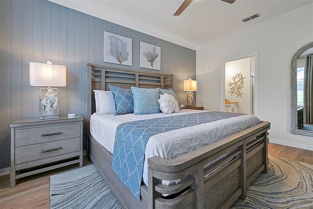 This master bedroom emphasizes a serene coastal-inspired aesthetic with a soothing palette of soft greys, whites, and muted blues. The bed features a substantial wooden frame with slatted and woven panel details, complementing the paneled accent wall behind it. Coordinating nightstands with sculptural, glass-based lamps flank the bed, enhancing the room’s balanced symmetry. The bedding showcases layered patterns in blue and white, which add visual interest while maintaining tranquility. The space includes light hardwood floors and a round, textured area rug that adds warmth. A large, arched mirror leans against the wall, amplifying natural light and creating a feeling of openness and calm.