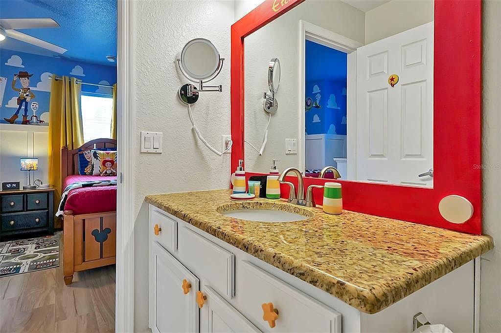 This bathroom features a granite countertop with a single under-mount sink and brushed nickel faucet. The cabinetry is white with playful orange star-shaped knobs adding a whimsical touch. Above the countertop hangs a large mirror framed in bold red, creating a striking contrast against the neutral walls. A wall-mounted magnifying mirror and soap dispenser set with green, yellow, and white stripes complement the space. Through the doorway, a vibrant children’s bedroom is visible, decorated with bright blue walls embellished with white clouds and Toy Story-themed decals, highlighted by bold yellow curtains and a wooden bed with cartoon-themed bedding.