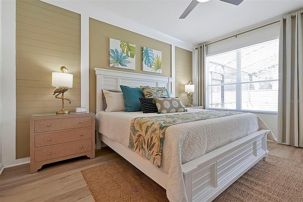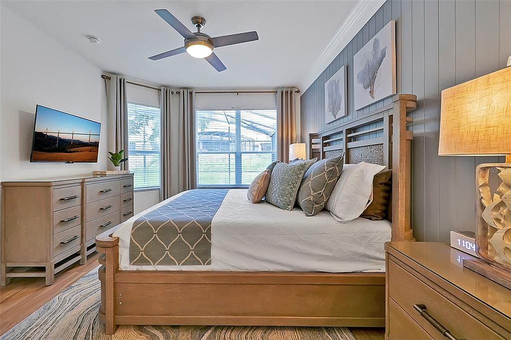 This master bedroom is designed for comfort and relaxation with natural wood furniture lending warmth to the space. A queen-sized bed with an intricate wooden headboard is accented by a variety of textured pillows and a neutral-toned quilt. Light gray wainscoting adds subtle architectural interest behind the bed. The room is illuminated by a modern ceiling fan light and a sculptural bedside lamp with a soft amber glow. Floor-to-ceiling windows are dressed with neutral curtains, allowing ample natural light and views of the outdoors, complemented by a wall-mounted flat-screen TV and a matching dresser for storage. The overall color scheme favors earthy neutrals and soft grays, creating a tranquil atmosphere.