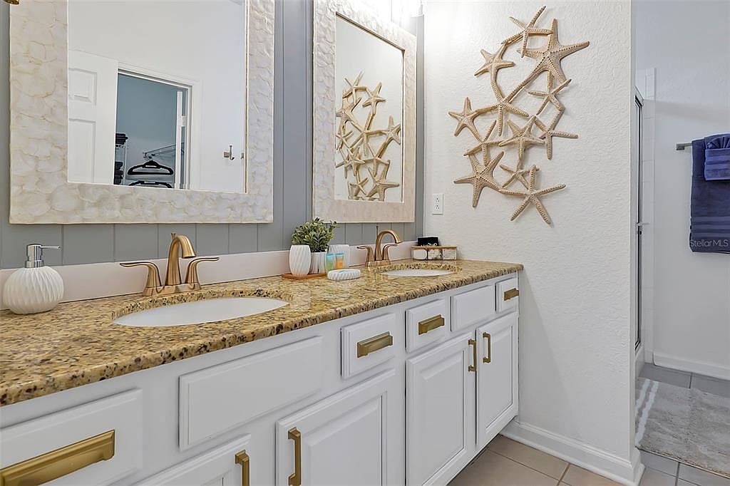 This spacious bathroom vanity features a warm granite countertop with two undermount sinks, highlighted by brushed gold-tone faucets and matching cabinet hardware. The cabinetry below is painted classic white, providing a crisp contrast to the rich countertop and enhancing the clean, coastal vibe of the space. Two large mirrors framed with textured, shell-like patterns add a subtle beach-inspired touch, mirrored by a creative wall décor of intertwined starfish shapes. Neutral-toned tiles cover the floor, leading toward a glass-enclosed shower area with navy blue towels, reinforcing a calming oceanic theme throughout the room.