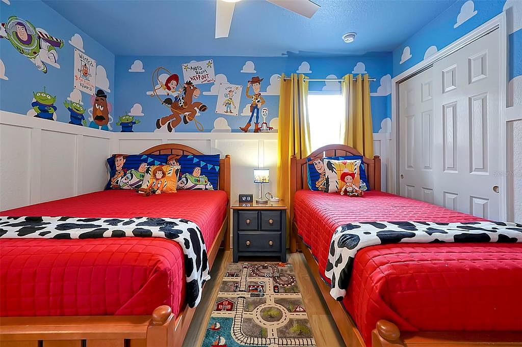 This vibrant children’s bedroom features two twin-sized wooden beds with matching red quilted bedspreads and playful cow-print throws at the foot of each bed. The walls are decorated with a blue sky and white cloud motif, bringing a whimsical atmosphere to the room. Above the wainscoting, colorful Toy Story characters add charm and personality, complemented by themed pillows and plush toys on each bed. A black nightstand with brass knobs sits between the beds, topped with a small lamp and digital clock. Bright yellow curtains frame a window, adding warmth and contrast to the playful, lively space. A small, patterned area rug with a town and road design extends between the beds, enhancing the room’s youthful and imaginative vibe.