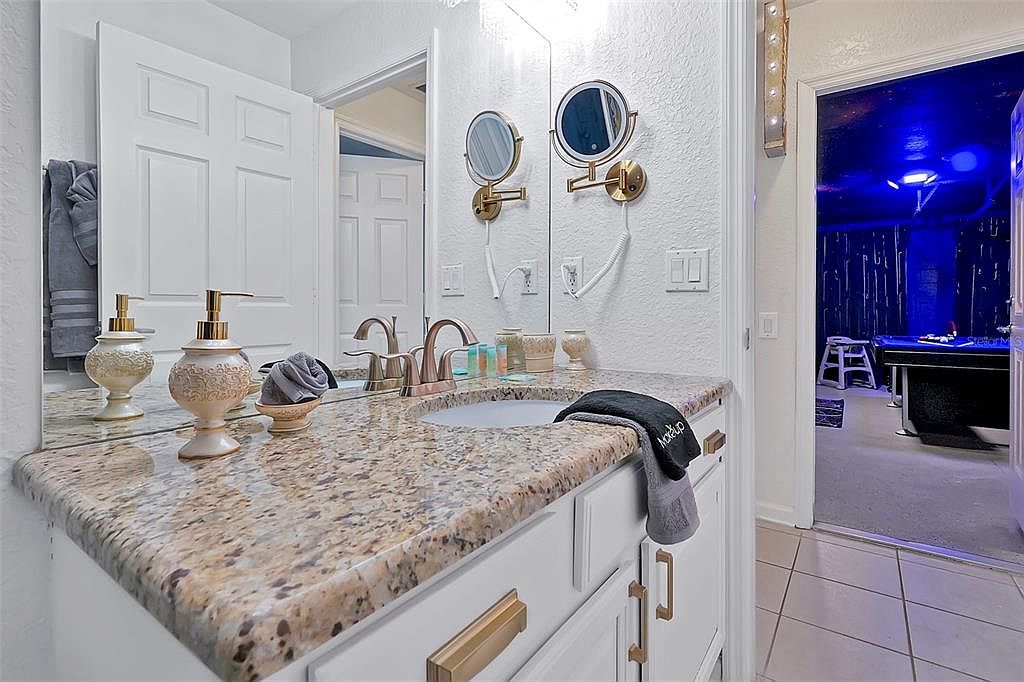 This bathroom features a spacious vanity with a polished granite countertop showcasing warm beige and brown tones. The white cabinetry below is adorned with modern brushed gold hardware, adding a touch of elegance. A large mirror spans the back wall, reflecting ample light and creating a sense of openness. Mounted on the wall beside the mirror are two adjustable round makeup mirrors with brass accents. The sink has a sleek bronze faucet, complimenting the countertop color palette. Beyond the vanity, there’s an adjoining room lit with striking blue lighting, hinting at an entertainment or game area. The tile floor is kept neutral, balancing the overall bright and sophisticated look.