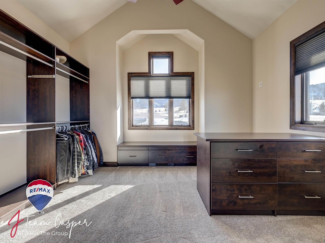 This walk-in closet features a spacious layout with custom dark wood cabinetry and built-in shelving designed to maximize storage. Clothing rods run along the left wall, holding a variety of hanging clothes, while a large dresser island with sleek metal handles sits centrally, providing abundant drawer space. A window with rich wooden trim invites natural light, softened by a pleated blind that adds texture and privacy. The neutral beige walls and carpet complement the dark furniture tones, creating a warm, elegant, and functional dressing area with vaulted ceilings enhancing the airy feel.