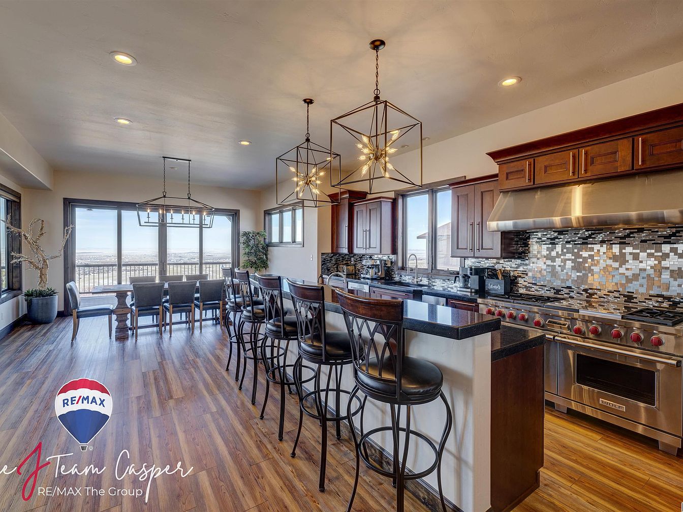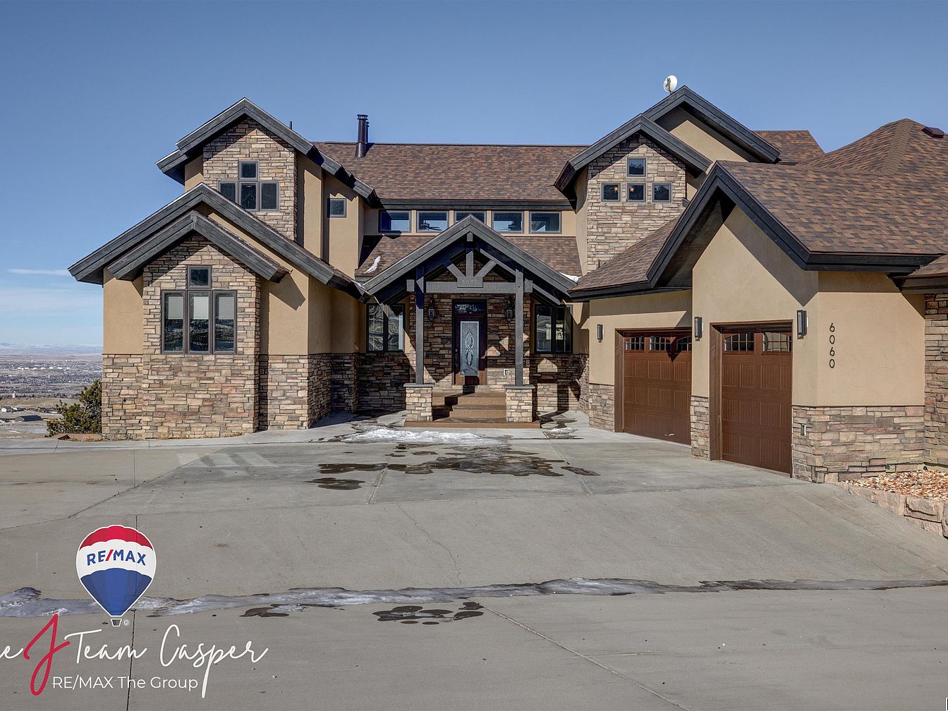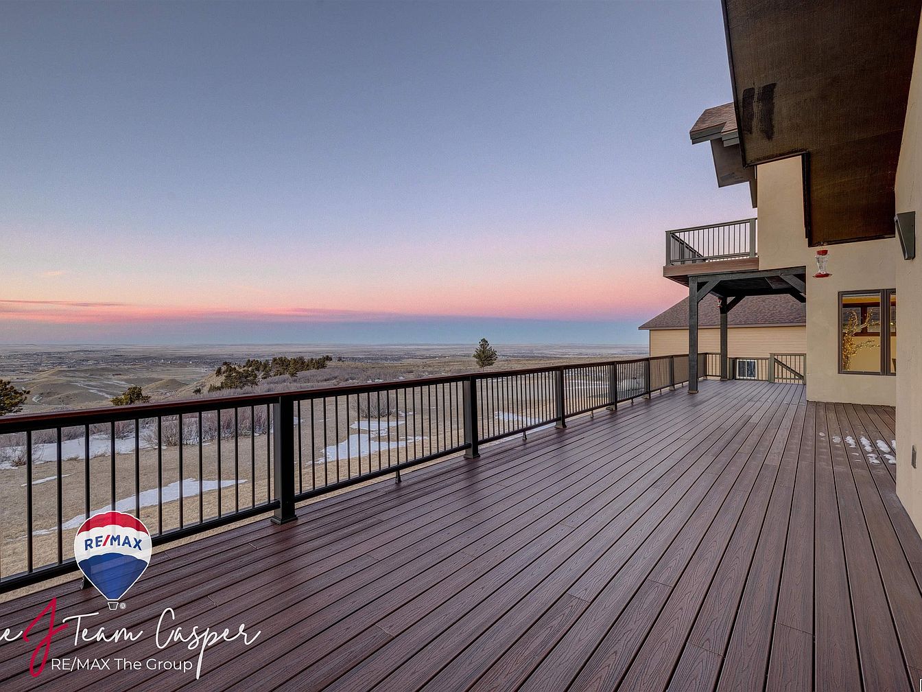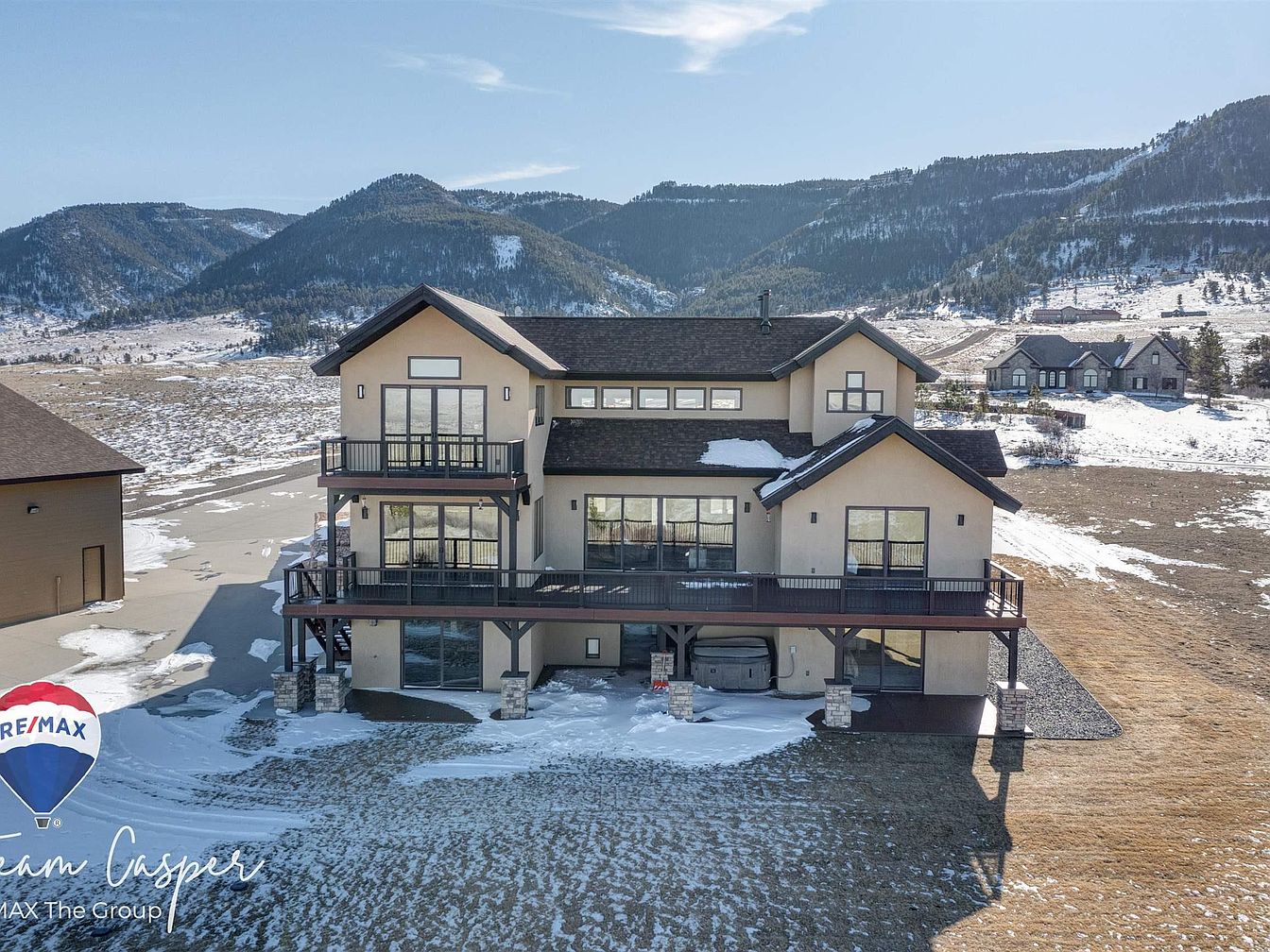 This impressive two-story home showcases a rustic contemporary architectural style, characterized by the combination of natural stone and stucco exterior with dark trim and multi-gable rooflines. Located at the base of Casper Mountain in Casper, Wyoming, the property offers stunning panoramic views of both the city and surrounding mountain landscape. The home rests on a spacious 3.29-acre plot, perfectly landscaped with a sprinkler system, new sod, rocks, and plants. Ideal for entertaining, it features an expansive deck and a cozy fireplace that invites relaxation while enjoying the city lights. The listing price for this exceptional property is $2,290,000, combining beauty, space, and functionality to create the perfect mountain foothills residence.