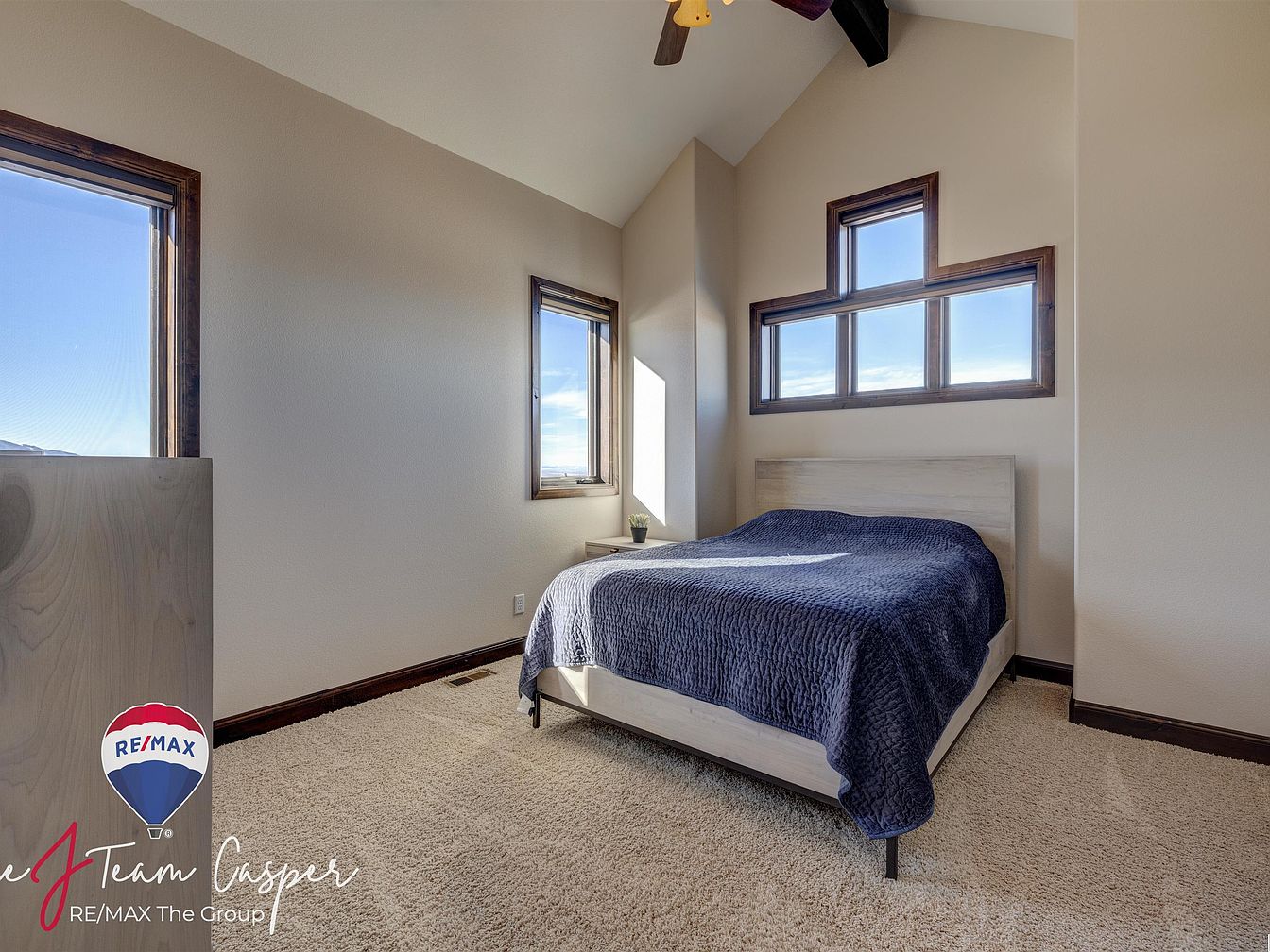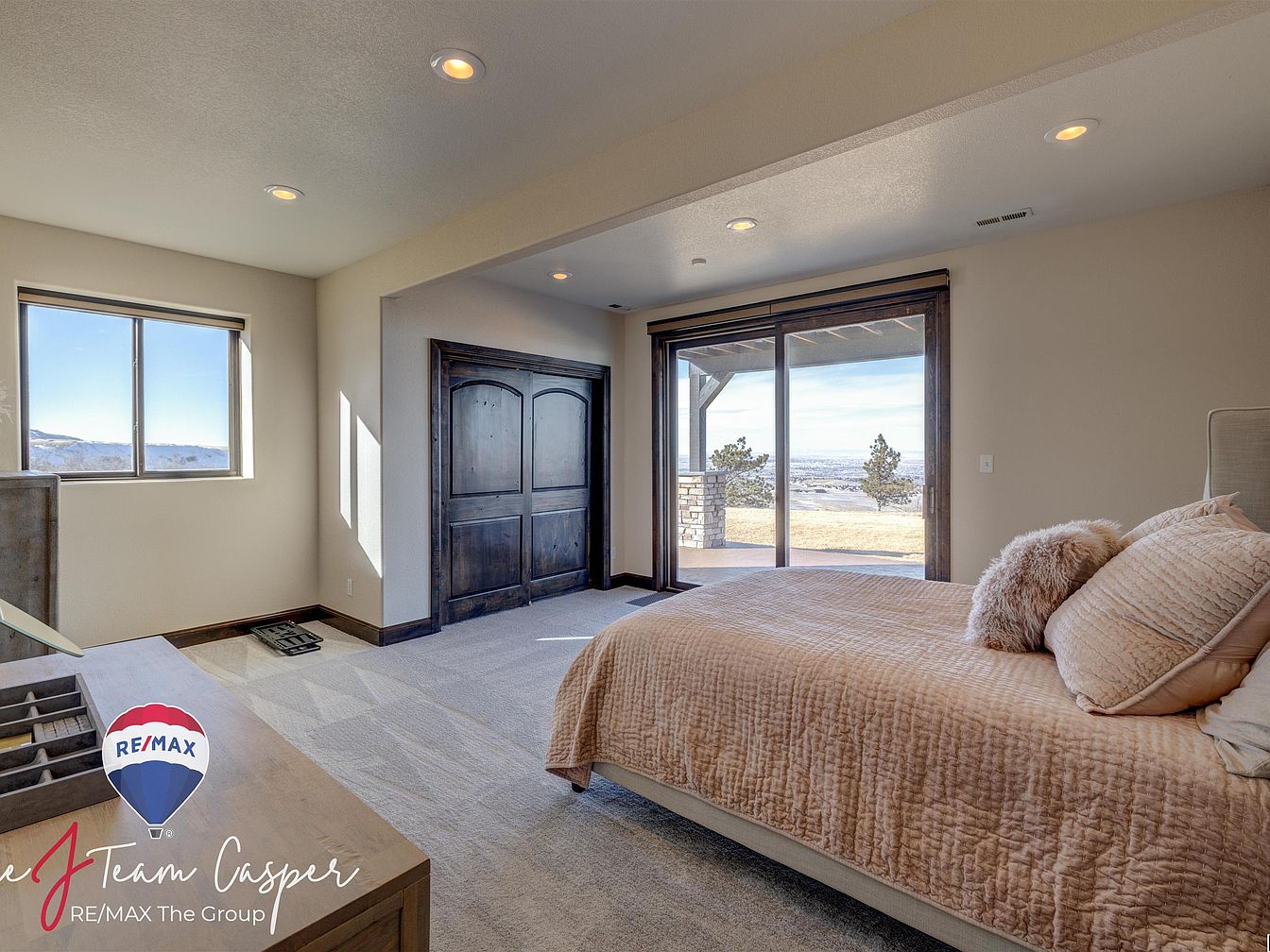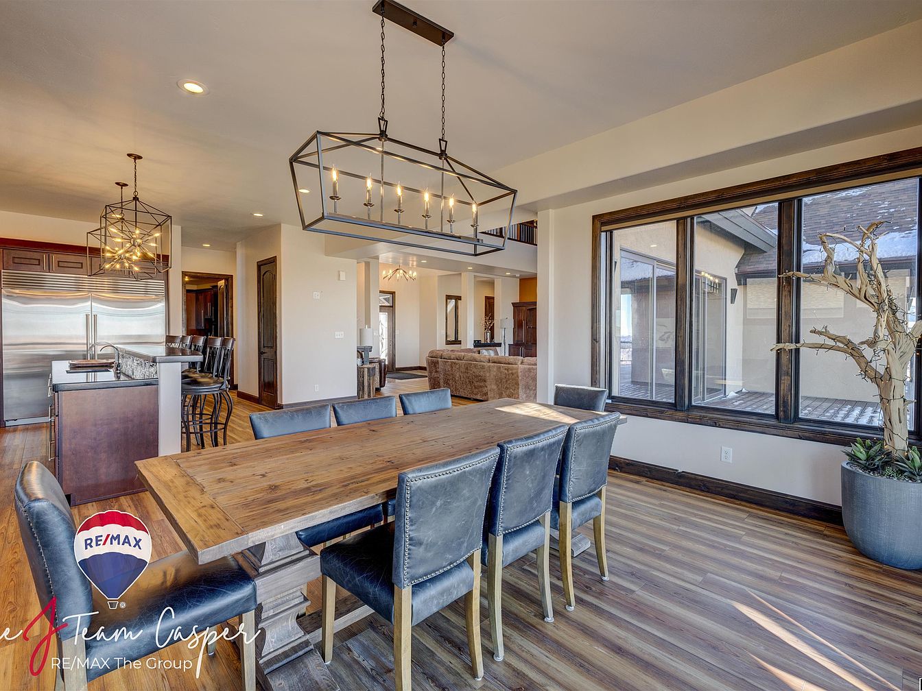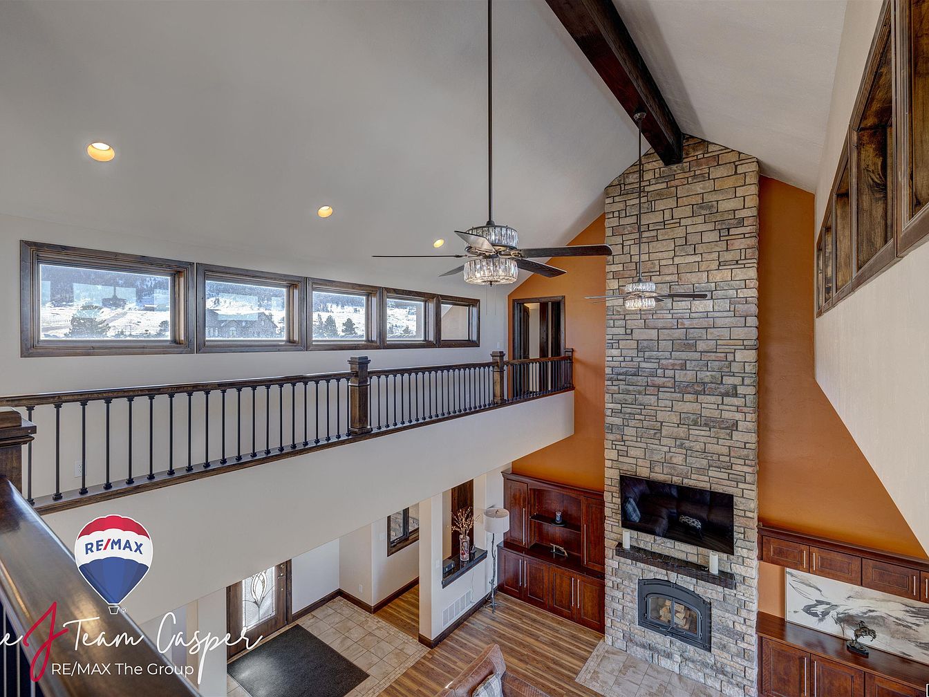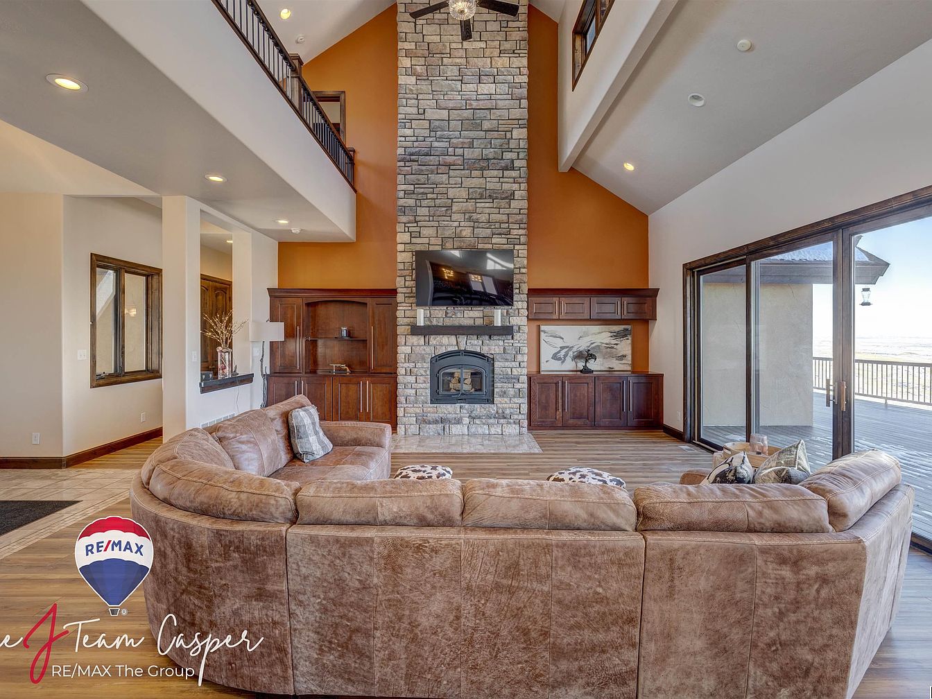 This impressive two-story home showcases a rustic contemporary architectural style, characterized by the combination of natural stone and stucco exterior with dark trim and multi-gable rooflines. Located at the base of Casper Mountain in Casper, Wyoming, the property offers stunning panoramic views of both the city and surrounding mountain landscape. The home rests on a spacious 3.29-acre plot, perfectly landscaped with a sprinkler system, new sod, rocks, and plants. Ideal for entertaining, it features an expansive deck and a cozy fireplace that invites relaxation while enjoying the city lights. The listing price for this exceptional property is $2,290,000, combining beauty, space, and functionality to create the perfect mountain foothills residence.