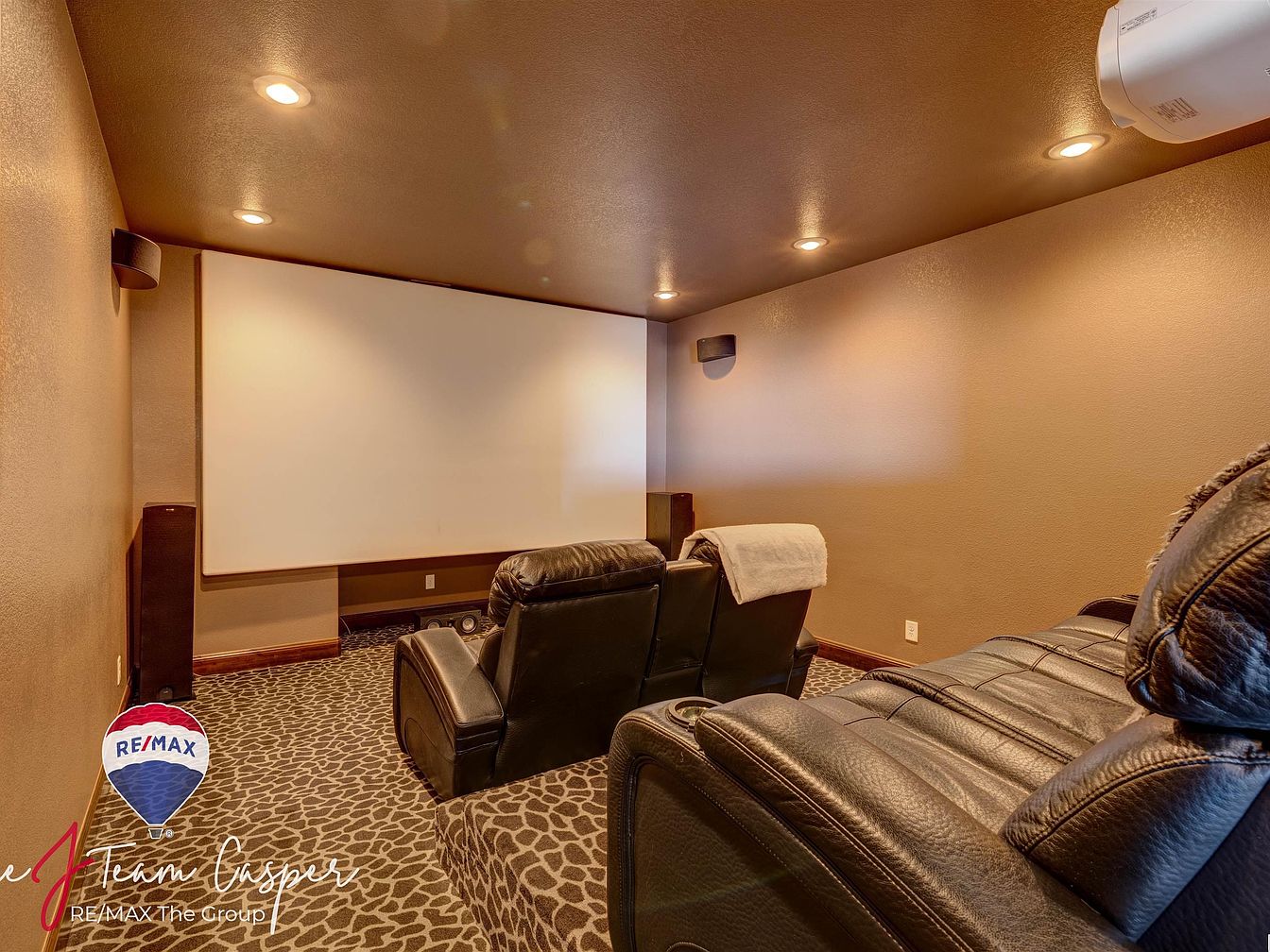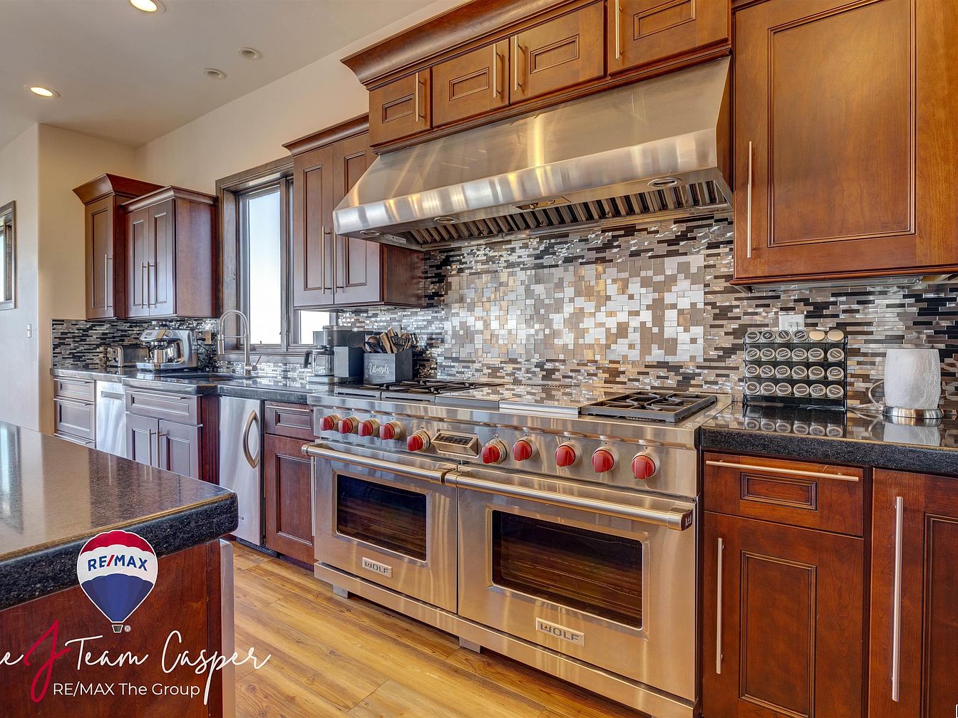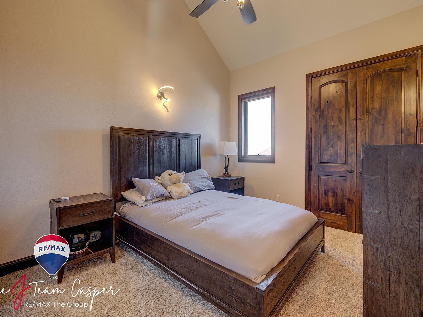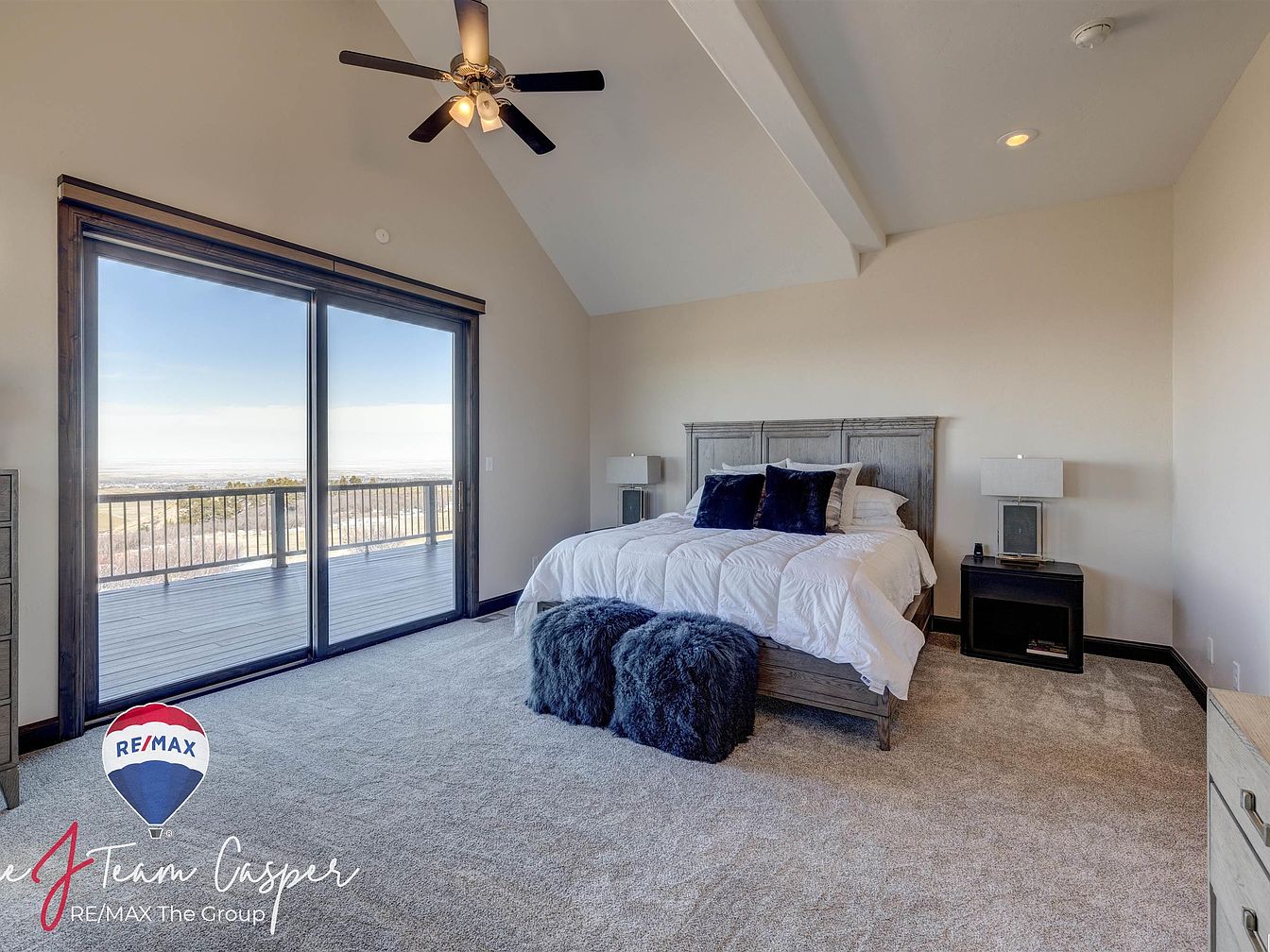 This impressive two-story home showcases a rustic contemporary architectural style, characterized by the combination of natural stone and stucco exterior with dark trim and multi-gable rooflines. Located at the base of Casper Mountain in Casper, Wyoming, the property offers stunning panoramic views of both the city and surrounding mountain landscape. The home rests on a spacious 3.29-acre plot, perfectly landscaped with a sprinkler system, new sod, rocks, and plants. Ideal for entertaining, it features an expansive deck and a cozy fireplace that invites relaxation while enjoying the city lights. The listing price for this exceptional property is $2,290,000, combining beauty, space, and functionality to create the perfect mountain foothills residence.