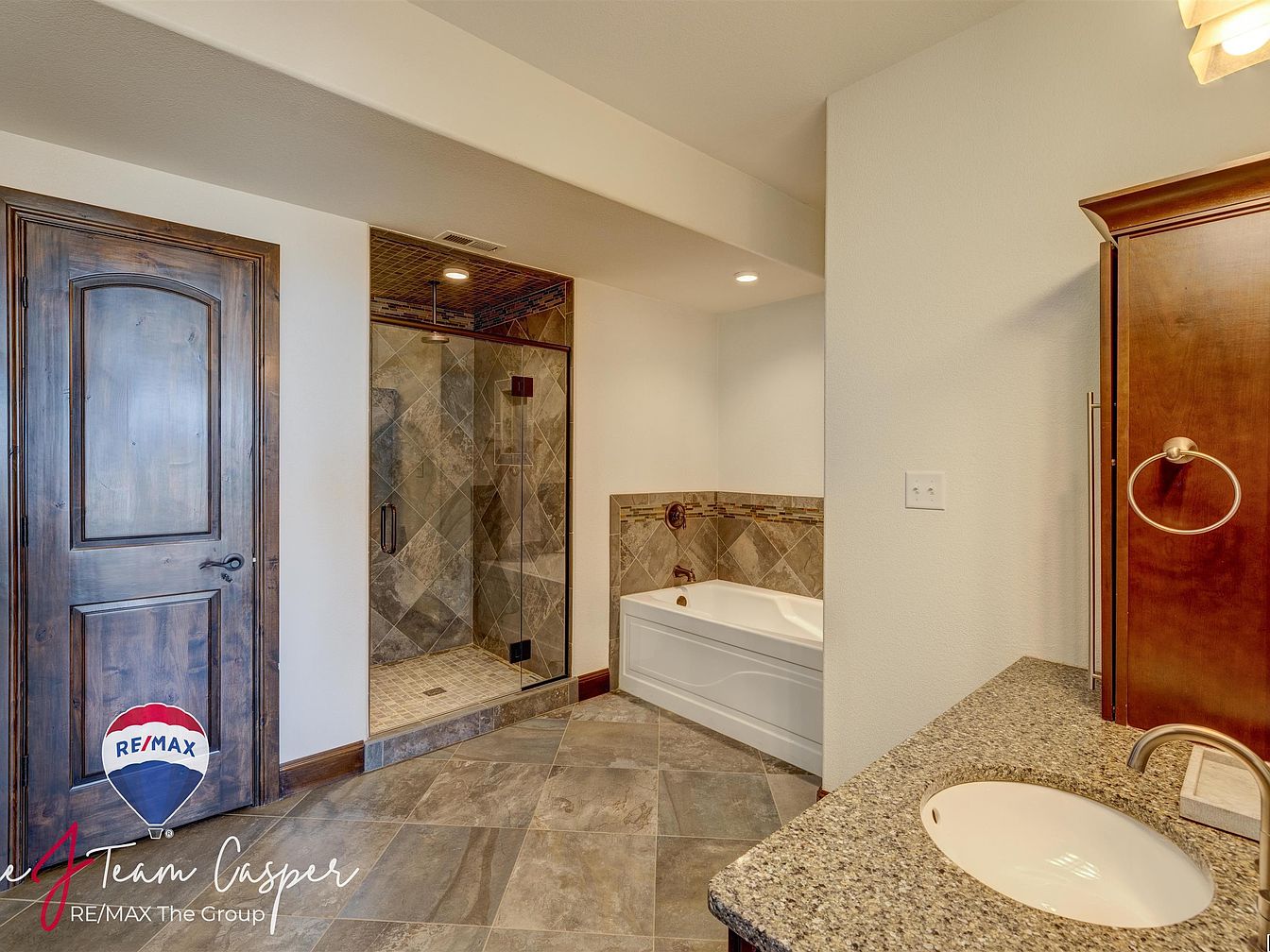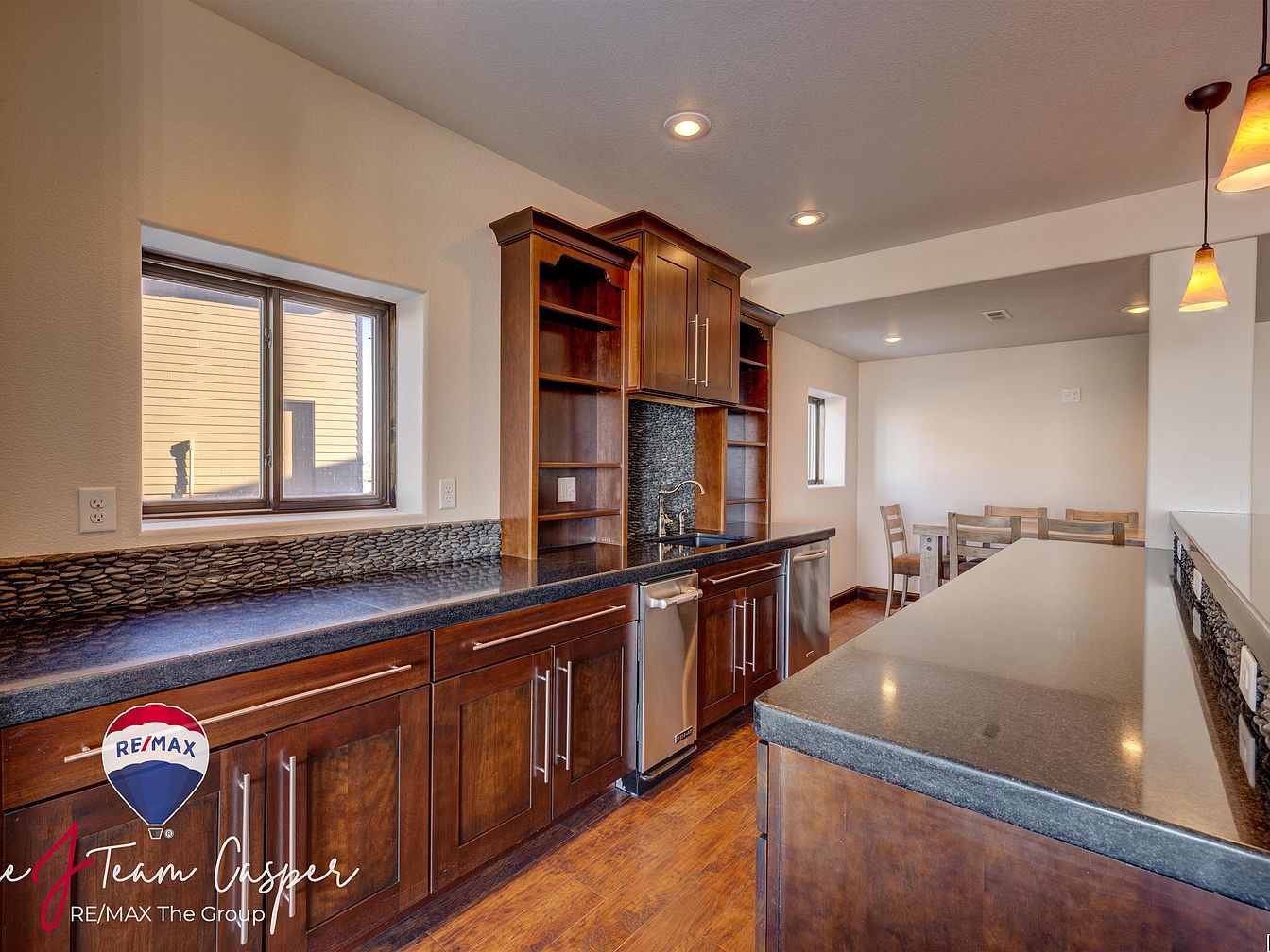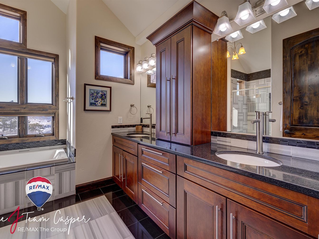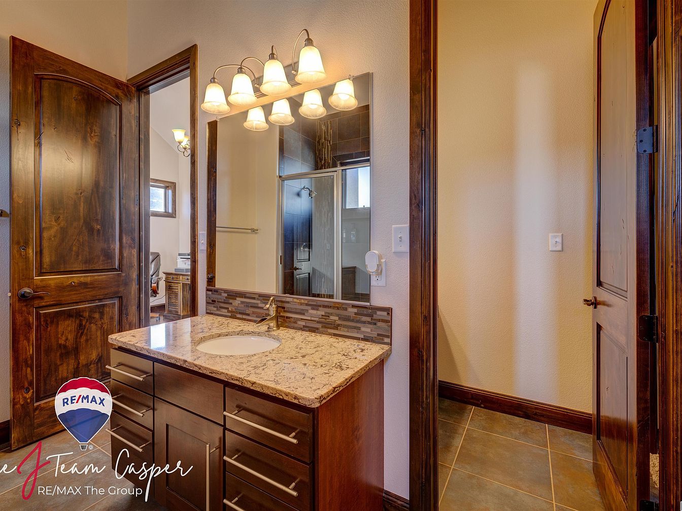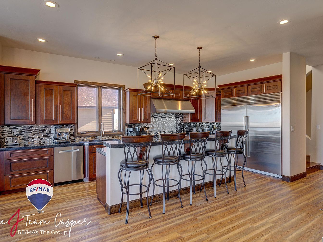 This impressive two-story home showcases a rustic contemporary architectural style, characterized by the combination of natural stone and stucco exterior with dark trim and multi-gable rooflines. Located at the base of Casper Mountain in Casper, Wyoming, the property offers stunning panoramic views of both the city and surrounding mountain landscape. The home rests on a spacious 3.29-acre plot, perfectly landscaped with a sprinkler system, new sod, rocks, and plants. Ideal for entertaining, it features an expansive deck and a cozy fireplace that invites relaxation while enjoying the city lights. The listing price for this exceptional property is $2,290,000, combining beauty, space, and functionality to create the perfect mountain foothills residence.