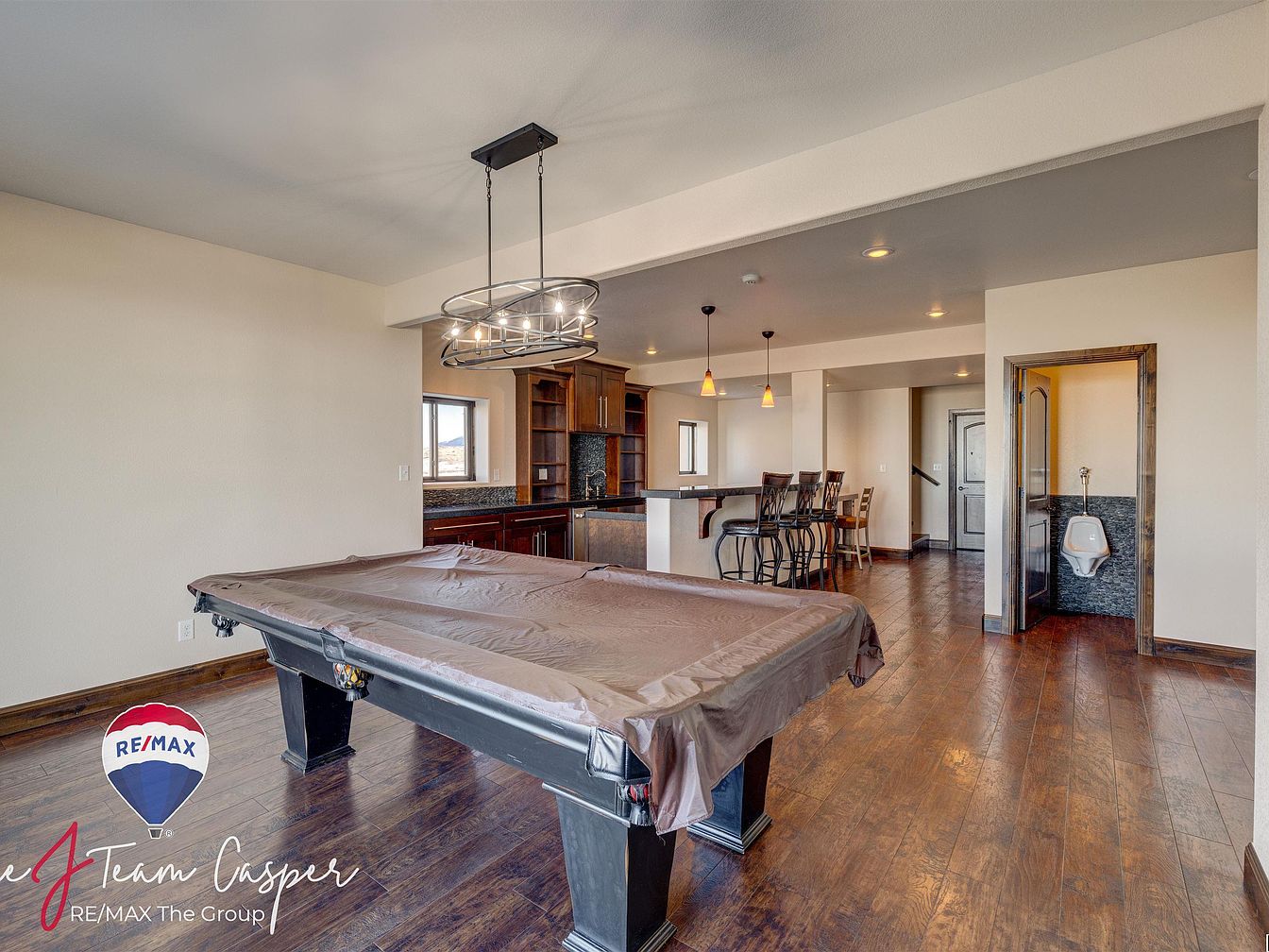 This inviting game room features rich dark hardwood flooring that adds warmth and elegance. A covered pool table anchors the space, positioned under a modern, circular chandelier with exposed bulbs, lending an industrial touch. The wet bar area showcases dark wood cabinetry paired with a sleek granite countertop and backsplash, creating a sophisticated contrast. Three high-back bar stools line the counter, perfect for socializing. Soft, amber pendant lights hang above the bar, enhancing the cozy ambiance. A small room with a urinal hints at added convenience, while neutral wall tones keep the room feeling open and airy.