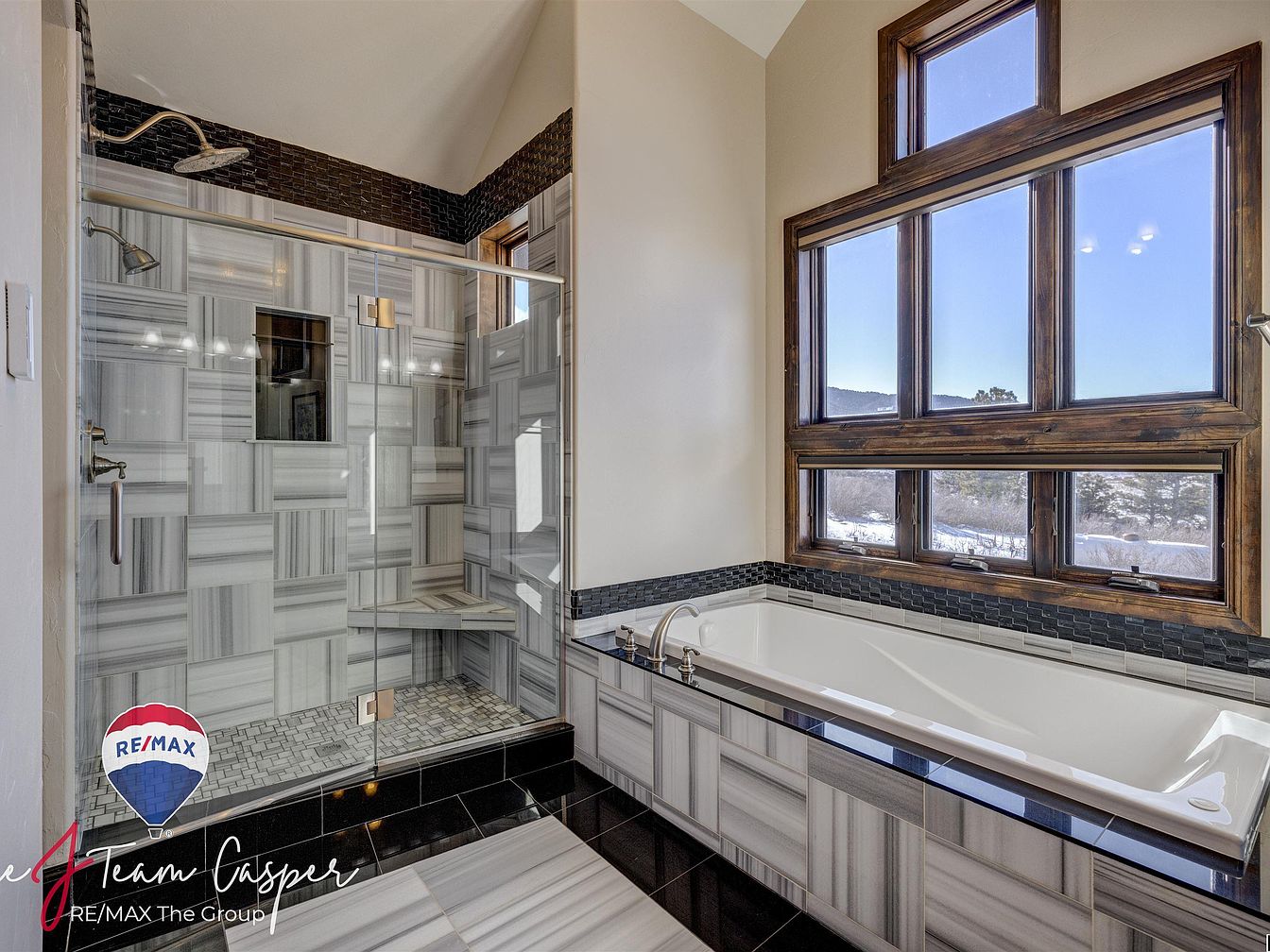 This bathroom features a spacious layout with a large built-in bathtub adjacent to a glass-enclosed shower. The shower showcases a tiled wall with a mix of vertically and horizontally aligned grey and white tiles, accented by a dark mosaic tile border near the ceiling. The bathtub surround mirrors the shower’s modern tile pattern, complemented by a glossy black countertop edge. Natural light floods the space through a set of wooden-framed windows, offering scenic outdoor views. The floor combines black and white tiles, adding contrast while maintaining a clean, contemporary aesthetic that blends functionality and style.