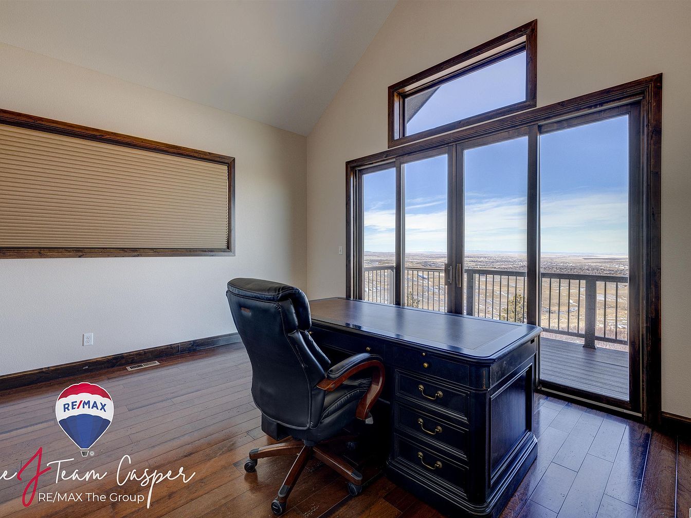 This home office features a spacious layout with a dark wooden desk positioned to maximize natural light from the large glass sliding doors that open onto a balcony. The balcony offers expansive views of a scenic landscape, enhancing the room’s tranquil atmosphere. The walls are painted in a soft neutral beige, complemented by rich wood trim around the windows and baseboards. A comfortable black leather swivel chair sits at the desk, blending classic professionalism with warmth from the hardwood flooring. Above the sliding doors, a high rectangular transom window adds architectural interest and extra daylight.