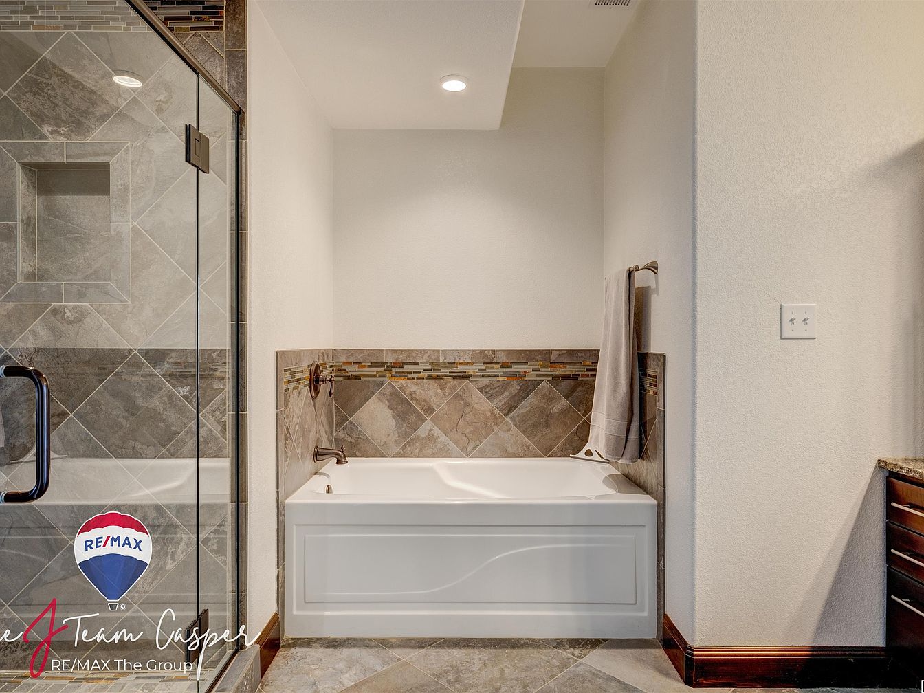 This bathroom blends modern and rustic styles with a spacious layout. The corner shower features large, textured stone tiles with an inset niche and is enclosed by clear glass panels with dark metal framing. Adjacent to the shower is a white bathtub surrounded by matching stone tiles that incorporate a decorative mosaic trim. The floor is tiled with large, diagonally-set stone slabs, continuing the earthy palette. To the right, a granite countertop sink with brushed metal fixtures sits beside a warm wooden cabinet. A solid wood door with a dark finish adds to the room’s cozy, refined feel.
