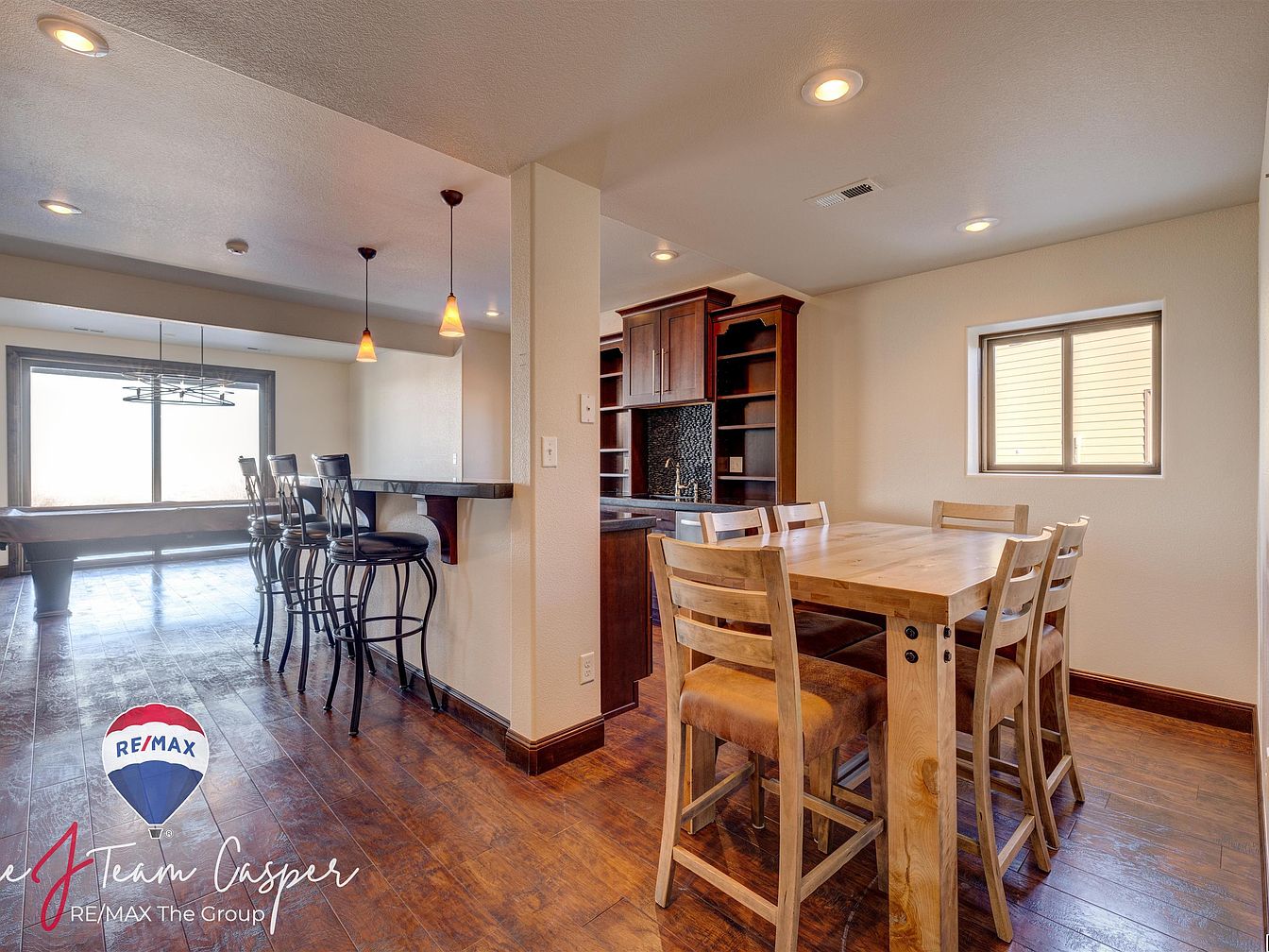 This spacious dining area features a large wooden table with six matching chairs upholstered in a warm, brown tone, creating an inviting space for family meals. The room is anchored by rich, dark hardwood floors that contrast beautifully with the light beige walls. Adjacent to the dining space is a cozy bar area with a polished dark countertop and three tall wrought iron stools with cushioned black seats. Above, two amber pendant lights provide warm illumination, while built-in wooden cabinetry with open shelving offers practical storage and adds classic elegance. A small window brightens the room with natural light, enhancing the warm and welcoming atmosphere.