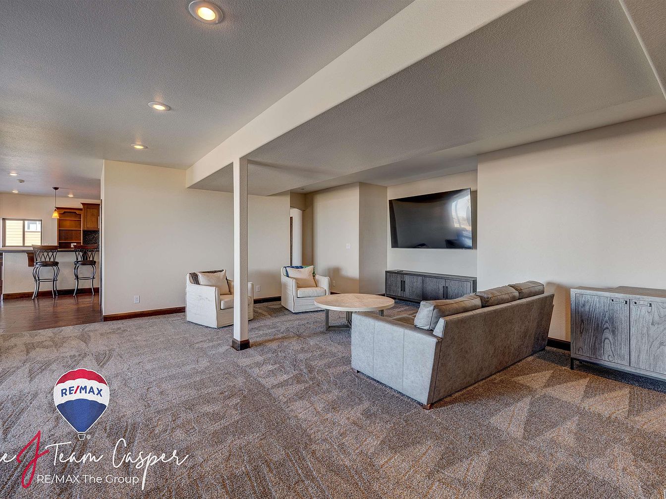 This spacious family room is defined by a soft, textured gray carpet that adds warmth and comfort. The seating arrangement includes a modern gray sofa paired with two off-white cushioned armchairs, placed around a round wooden coffee table, creating an inviting space for relaxation or conversation. The large flat-screen TV is mounted on the wall above a sleek, low-profile dark wood media console, blending functionality with minimalist style. Recessed lighting in the textured ceiling provides even illumination, while the open layout connects seamlessly to the kitchen area visible through an open wall, enhancing the home’s flow and social atmosphere.