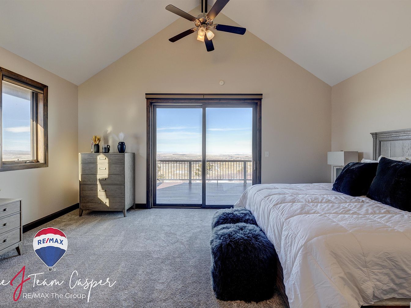 This spacious master bedroom features a vaulted ceiling with a dark ceiling fan, enhancing the airy ambiance. Neutral beige walls and gray carpeting create a calming atmosphere, while the large sliding glass doors open to a balcony offering expansive natural views. The room is furnished with a sizable bed dressed in white bedding accented by black pillows and two plush dark furry ottomans at its foot. Matching wooden furniture pieces—a tall dresser and a nightstand with clean lines—add a contemporary touch, complemented by minimal decorative vases. The overall aesthetic combines comfort, simplicity, and a connection to the outdoors.