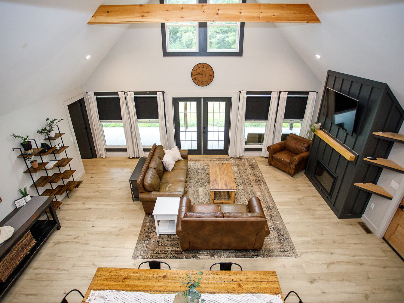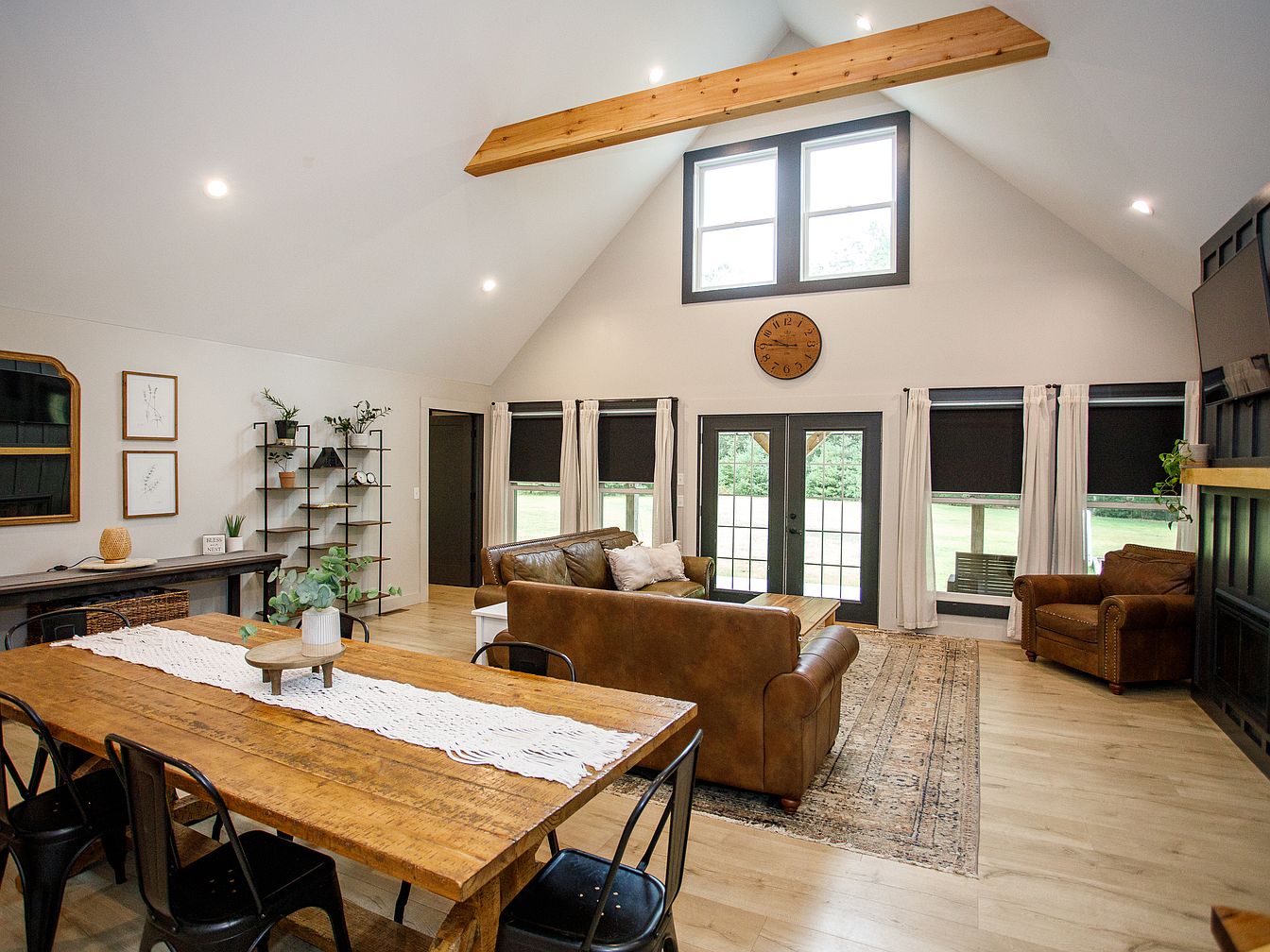 A spacious room features light wood floors and soaring vaulted ceilings accented by exposed wooden beams. The sitting area includes a caramel leather sofa, matching armchair, and a patterned area rug. Black-framed windows and French doors line the far wall, framed by white curtains, letting in ample natural light and offering a view of a green lawn. On the left, a large rustic wooden dining table is surrounded by black metal chairs, and nearby shelving displays plants and decorative items. Wall art and a round wooden clock complement the room’s modern farmhouse aesthetic in earthy, neutral tones with contrasting dark accents.