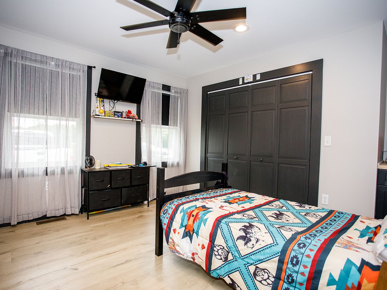 A contemporary bedroom features light wood flooring and soft gray walls for a tranquil backdrop. Two tall windows along one wall are dressed in sheer white curtains, letting in natural light and creating an airy feel. A black dresser with fabric drawers stands beneath a mounted television and shelf displaying small items. Against another wall, a twin-sized bed sports a vibrant southwestern-patterned quilt featuring turquoise, red, and orange geometric designs and horse motifs. A large double-door black closet adds drama with its dark trim matching the bed and dresser, while a black modern ceiling fan with recessed lighting enhances the room’s sleek, functional aesthetic.