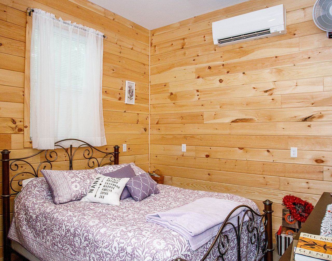 A cozy bedroom with light natural wood paneling covering the walls, showcasing rustic charm and warmth. The window is dressed with sheer white curtains that softly filter daylight, while a white split-unit air conditioner is mounted above for climate control. A dark metal bed frame with ornate swirling details holds a bed layered in lavender and white floral-patterned bedding, with accent pillows in purple and white. On the right, a simple wooden dresser holds a stack of books and a small red floral arrangement, adding a touch of color. The overall atmosphere is inviting and homey.