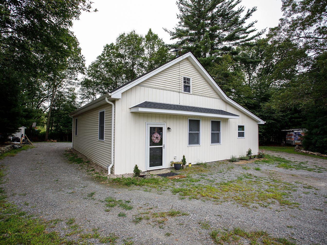 A quaint, single-story house with cream-colored horizontal siding sits amidst a wooded landscape. The roof is dark gray with a simple triangular gable at the front, and there is a small covered entryway. Three symmetrically placed windows and a glass door topped with a decorative wreath provide a friendly, inviting appearance. The driveway, made of packed gravel, curves around the home, and a few small shrubs and potted plants line the entryway. Mature trees and dense greenery surround the property, giving it a private, serene feeling. The overall aesthetic blends rural charm with understated simplicity.