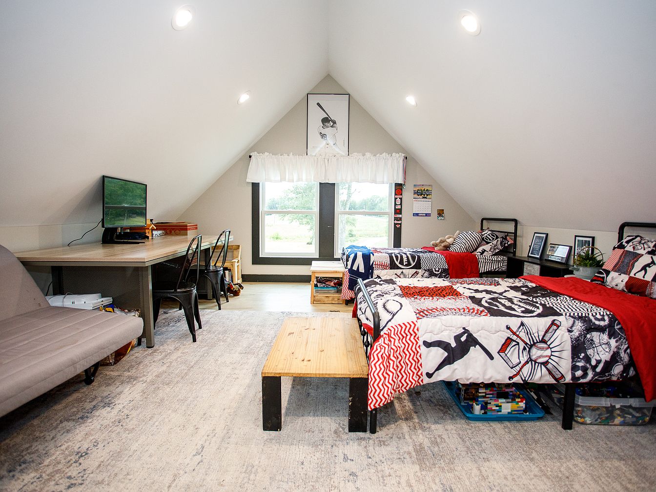 A cozy attic bedroom with a steeply pitched ceiling features two twin beds side by side, each with colorful, sporty bedding in red, black, and white. There are low black metal headboards and individual nightstands displaying framed photos and a potted plant. Under each bed, clear storage bins are visible, maximizing space. At the foot of the beds, a simple wooden bench sits on a soft, neutral-toned area rug. Across from the beds, a long desk holds a computer monitor and is paired with metal chairs, perfect for studying or hobbies. Natural light fills the room through a large window, trimmed in gray.