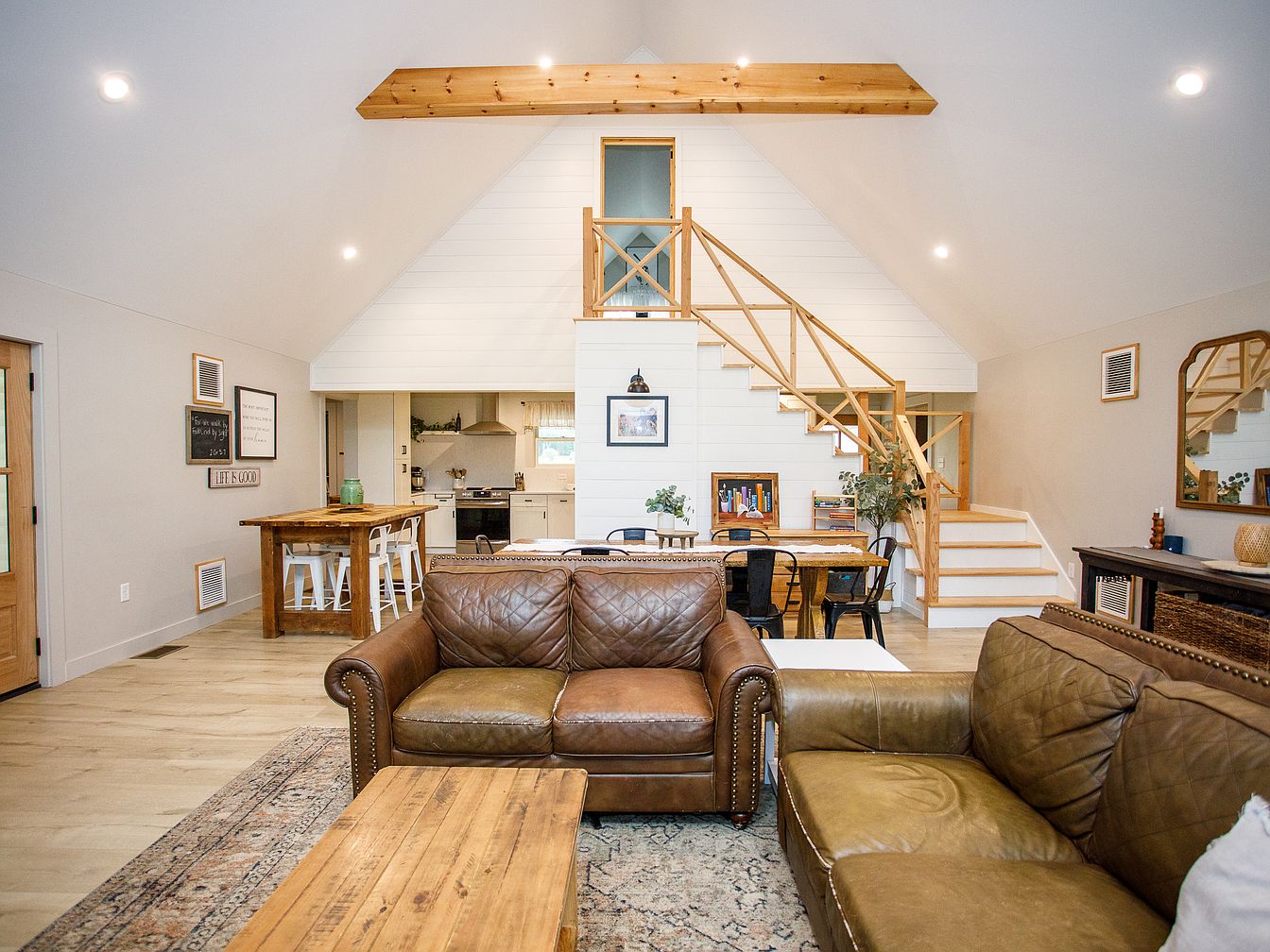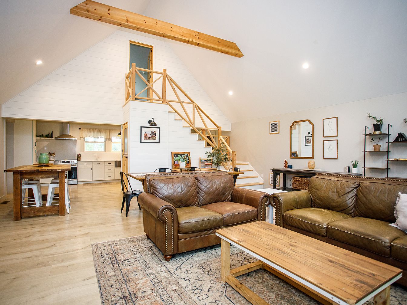 A spacious open-plan living room features vaulted ceilings with exposed wooden beams and a soft, neutral color palette. Two brown leather sofas are arranged around a rustic wooden coffee table and an intricately patterned area rug. The room includes a long dining table with black metal chairs and a wooden kitchen island paired with white barstools. White shiplap walls and light wood floors create a bright, airy atmosphere. A staircase with simple natural wood railings leads to a loft area with a blue-trimmed door. Minimalist decor, framed quotes, and plants add warmth and a welcoming touch.