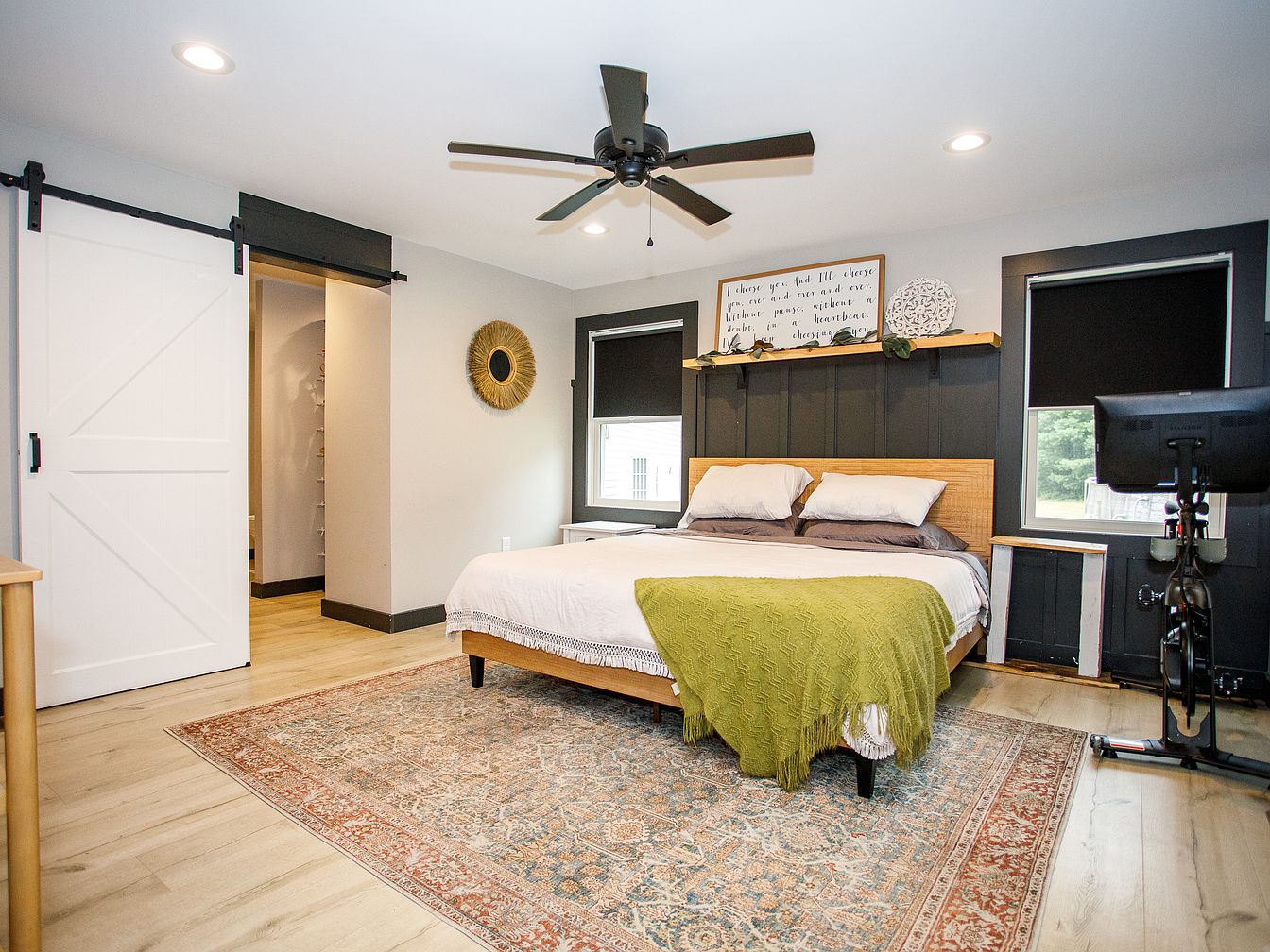 A spacious bedroom featuring light wood flooring and a large, patterned rug in soft reds and blues. The bed has a woven wooden headboard, layered white and gray bedding, and a bright green throw blanket. Two black-trimmed windows flank the bed, bringing in natural light, with blackout shades for privacy. Above the bed, a wall shelf holds decorative items and a sign with writing. A stylish ceiling fan hangs overhead. The walls are painted light gray, contrasted by a charcoal black accent behind the bed. A white sliding barn door leads to a walk-in closet, adding a modern rustic touch.