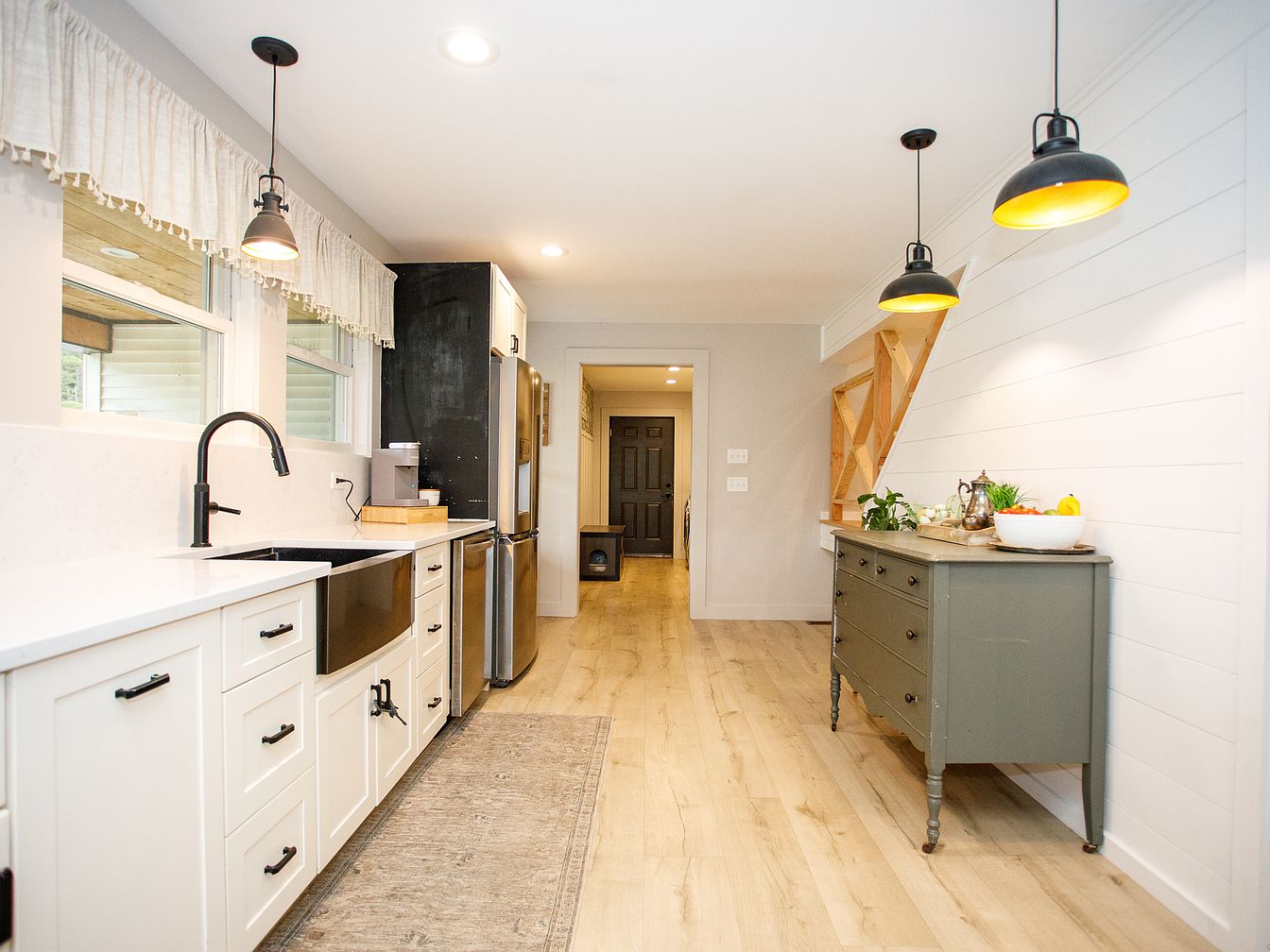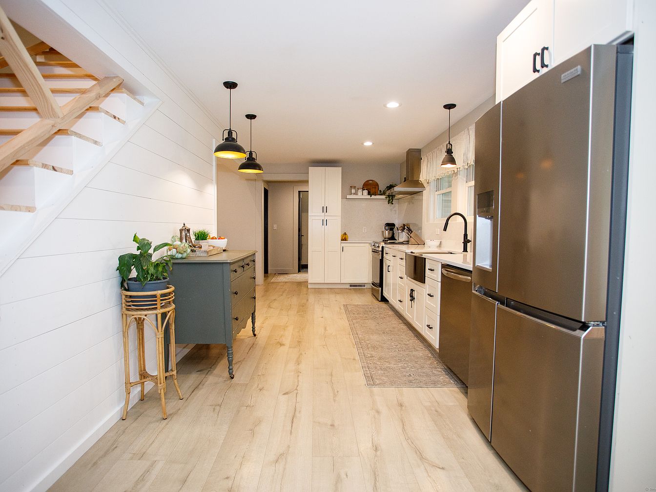 A bright, spacious kitchen with a streamlined galley layout features light wood flooring and shiplap white walls. Stainless steel appliances, including a large refrigerator, anchor one side of the space. Shaker-style white cabinetry lines the right wall, complemented by matte black hardware and a farmhouse-style sink beneath a window adorned with a delicate valance. Two industrial pendant lights hang above a green vintage sideboard topped with fresh plants and kitchen accessories. The open staircase with natural wood treads adds architectural interest, while a neutral rug runs along the kitchen, softening the modern, clean look with a touch of warmth.