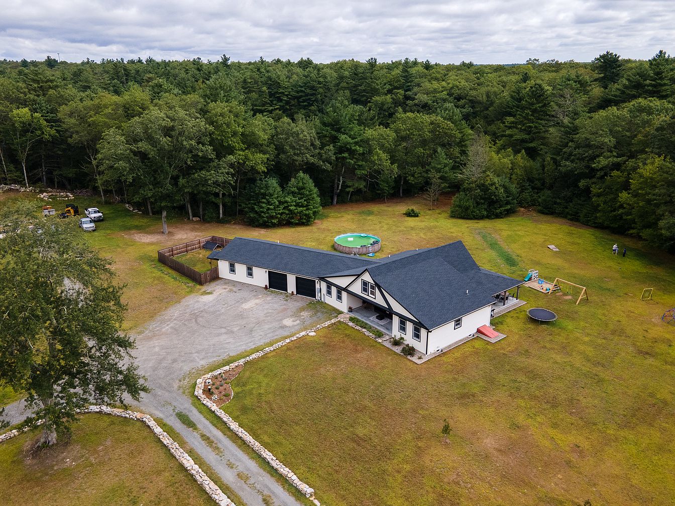 Aerial view of a single-story home with a sprawling layout, sitting on a large open plot surrounded by dense forest. The house features a dark gray hipped roof, white siding with black accents, and multiple entry points. The front yard is bordered by a low stone wall and a gravel driveway leading to the entrance and parking area. Outdoor amenities include a green circular pool, a wooden swing set, and a trampoline, all placed on the expansive lawn. Trees provide natural privacy, and the overall atmosphere is tranquil, spacious, and set amidst the serene beauty of nature.