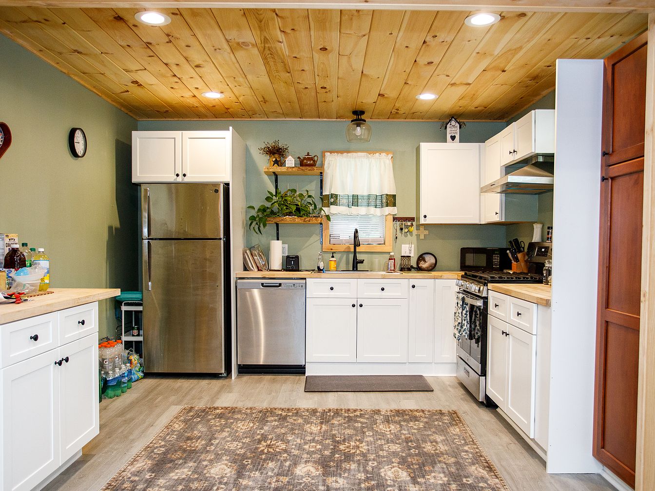 This kitchen features a cozy, rustic design with a warm wooden tongue-and-groove ceiling and sage green walls that complement white shaker-style cabinetry. The countertops are light-toned wood, and modern stainless steel appliances, including a refrigerator, dishwasher, and gas range, add a contemporary touch. A central window above the sink is dressed with a farmhouse-style curtain, letting in natural light. Open shelves holding plants and simple kitchenware provide homey touches. The floor is light-colored wood or laminate, with a patterned area rug in earth tones softening the space. Soft, recessed lighting enhances the inviting and practical ambiance.