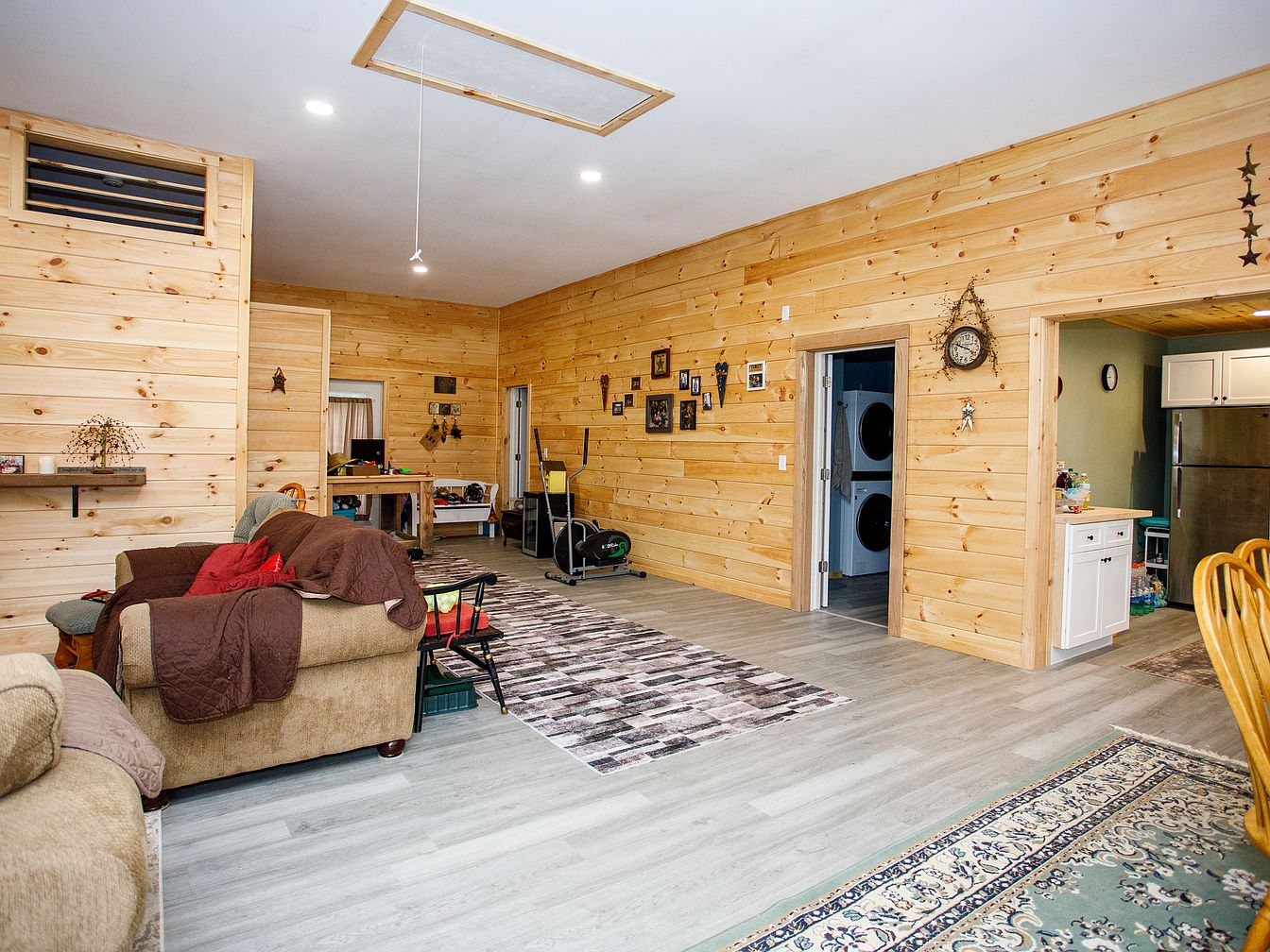 A spacious open-plan room with natural light pine paneling covers the walls, giving a cozy cabin feel. Pale gray-toned laminate flooring runs throughout, softened by patterned area rugs. The furniture includes tan sofas draped with brown and red throws, creating a warm, inviting atmosphere. The decor features small framed photos and rustic wall hangings, enhancing the historic and personal ambiance. At the back, a laundry nook with a stacked washer and dryer is visible through an open doorway. Adjacent to the laundry space, a kitchen area with white cabinetry and stainless steel appliances adds a modern touch to the historic setting.