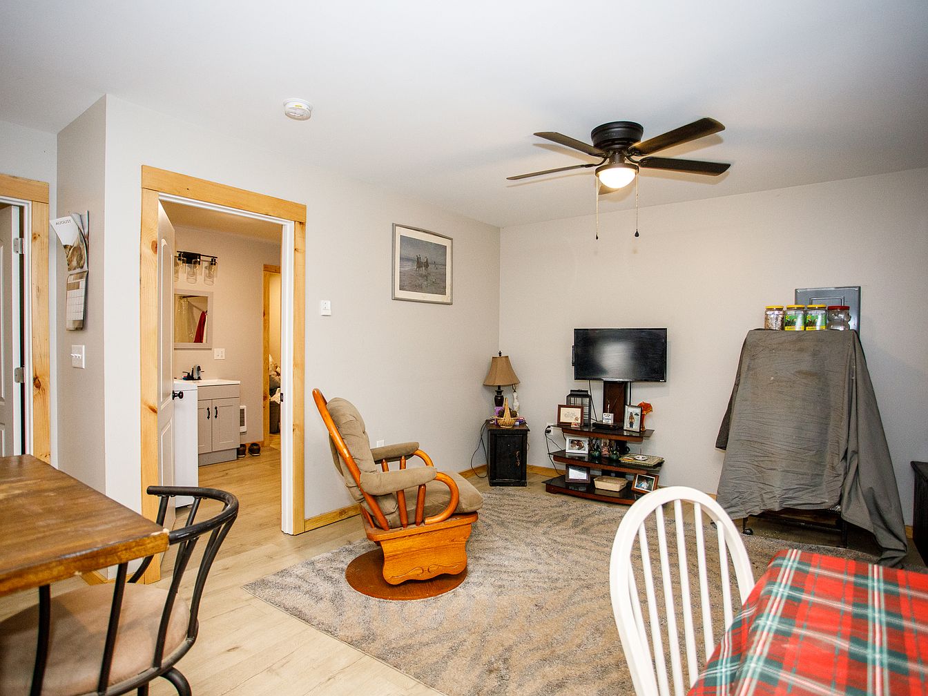 This space features a cozy and functional living room with light wood trim and neutral walls that create a warm, inviting environment. A light-colored, patterned rug centers the space, supporting a wooden rocking chair that sits adjacent to a small side table and lamp. A flat-screen TV is mounted on the wall above a compact entertainment unit displaying photos and decorative items. The ceiling hosts a modern black ceiling fan with a light. There is a plaid tablecloth on a farmhouse chair and a covered object near the wall. The room connects openly to a bathroom and another hallway, blending utility and comfort.