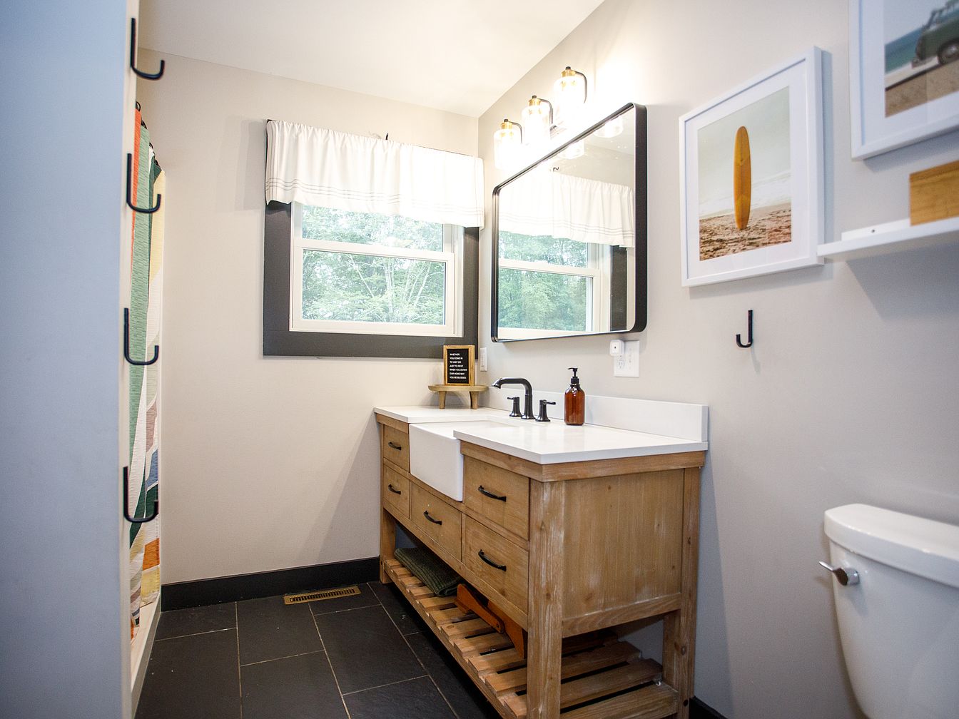 A bright and inviting bathroom features a wooden vanity with a white countertop and integrated rectangular sink. The vanity has black hardware and an open lower shelf for towels. Above the vanity, two clear-glass light fixtures are mounted above a large, modern rectangular mirror with a black frame, reflecting natural light from a window framed in charcoal gray. The walls are painted soft ivory, complementing the slate-tiled floor. A minimalist, coastal-themed photo of a surfboard hangs on the wall, adding a casual, artistic touch. Clean lines, natural textures, and practical details create a relaxing and functional environment.
