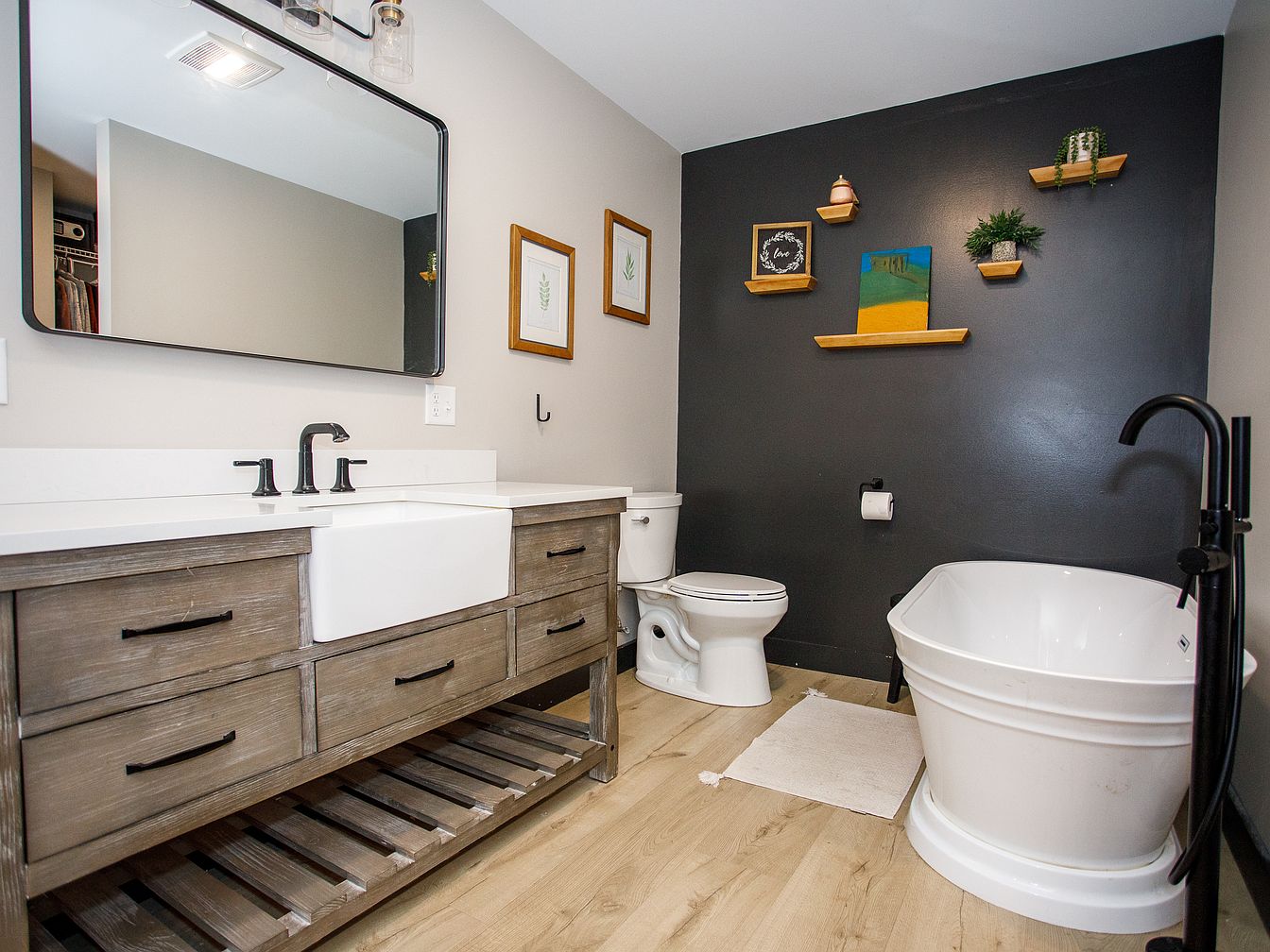 This bathroom features a striking mix of rustic and modern elements. The vanity is made of weathered wood with black metal handles and a white farmhouse-style sink, topped by a wide rectangular mirror with black trim. The black wall opposite the sink creates a dramatic focal point with floating wooden shelves displaying small potted plants and framed art. A freestanding white soaker tub is paired with a contemporary black faucet. The light wood flooring adds warmth, while the neutral wall colors keep the space feeling open and calming. Minimalistic decor and greenery provide a refreshing touch.
