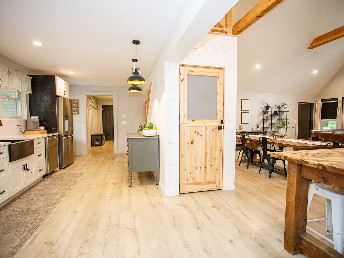 A spacious transitional area between the kitchen and dining room features pale wooden floors and a high, vaulted ceiling with exposed beams adding warmth and character. The kitchen section includes crisp white cabinetry, stainless steel appliances, and a farmhouse sink, complemented by a subtle patterned rug and a small potted plant. Overhead black and yellow pendant lights hang above an antique green sideboard, bringing charm to the neutral palette. A light wood Dutch door with frosted glass sits at the center, adjacent to a rustic wooden dining table surrounded by sleek black metal chairs. The walls are adorned with minimalist shelves and framed art, blending farmhouse and modern aesthetics seamlessly.