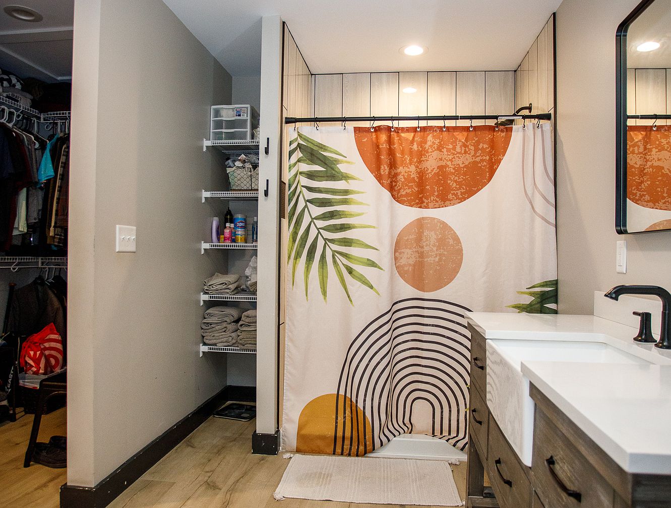 This bathroom features a dual vanity with sleek white countertops and dark cabinet drawers, accompanied by a modern matte black faucet. A bold shower curtain with geometric circles in burnt orange and black, plus green palm fronds, adds a pop of color and mid-century flair. The walls are painted a soft taupe, and the floors are a light, natural wood plank. To the left, open shelving neatly holds towels and toiletries, adjacent to a spacious walk-in closet filled with hanging clothes and storage bins. Subtle recessed ceiling lights provide ample illumination, while the overall décor blends warmth with modern simplicity.