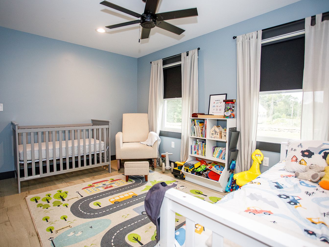 A bright and tidy children’s bedroom features pale blue walls and light wood floors, creating a calm, playful atmosphere. A gray crib sits to the left, paired with a soft beige armchair and matching small ottoman near the window. Two large windows are dressed with long, beige curtains and black roller shades, letting in natural light. A white bookshelf filled with colorful books, toys, and puzzles stands beneath the windows. The playful theme extends to the bedding, decorated with vehicle prints, and a cheerful area rug designed with winding streets, cars, and green trees. A cheerful yellow ride-on duck adds whimsy.