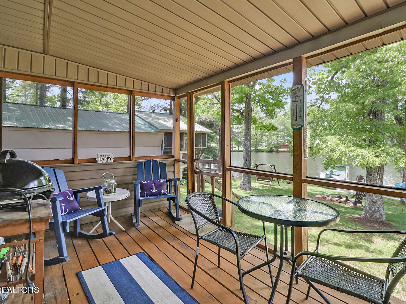 This cozy screened porch features natural wood flooring and trim, complementing the outdoor setting. A pair of navy blue Adirondack chairs with anchor-themed cushions provide comfortable seating alongside a small white side table for drinks or decor. On the opposite side, a round glass-top table and woven metal chairs create a casual dining space. The porch offers stunning views of a serene lake through large screened windows, allowing fresh air without pests. Light, neutral tones on the siding and ceiling add to the relaxed, nautical-inspired vibe, perfect for peaceful afternoons and entertaining.