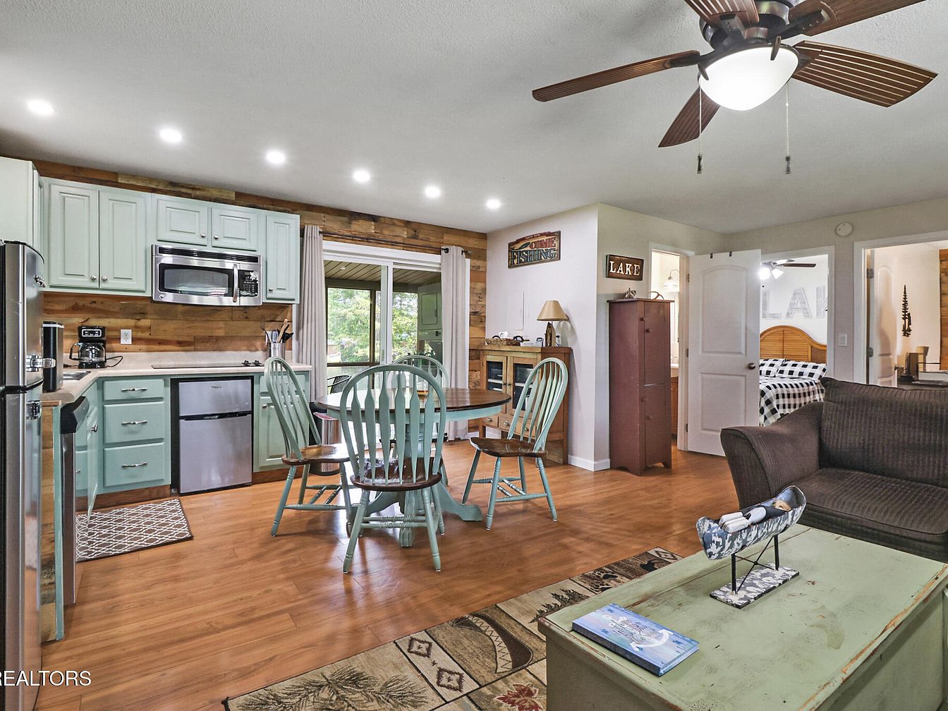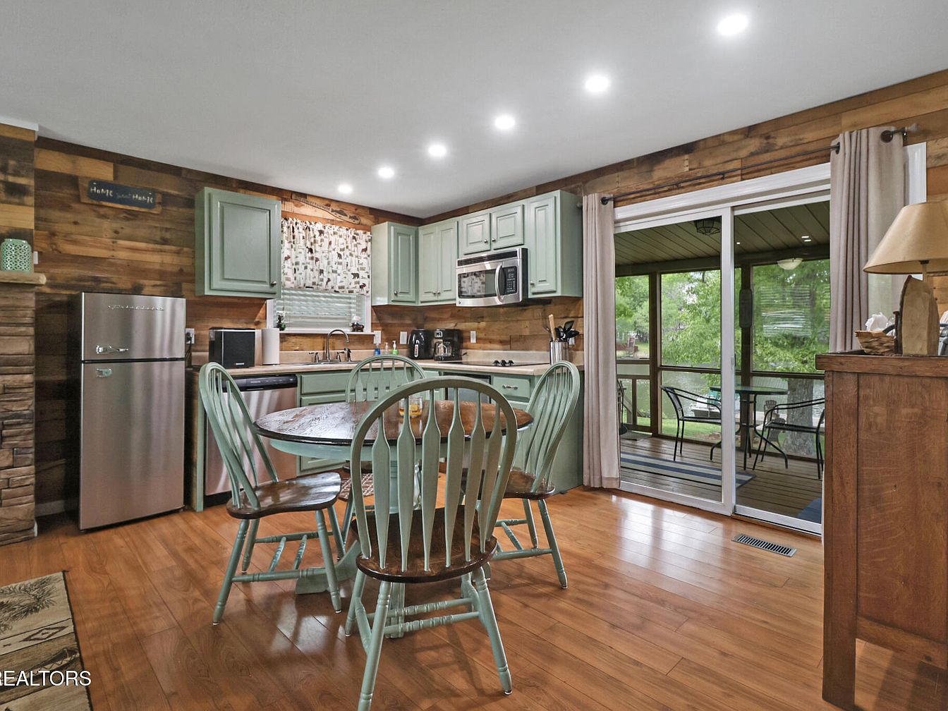 This cozy, open-concept space blends kitchen and dining functions with warmth and practicality. Soft sage green cabinets complemented by stainless steel appliances create a fresh yet rustic vibe, enhanced by the natural wood accent wall behind the kitchen. A round wooden dining table with matching green chairs sits centrally on warm hardwood floors, promoting easy conversation and functionality. White walls and recessed lighting brighten the room, while a ceiling fan adds comfort. Sliding glass doors lead outside, inviting nature inside. Decorative elements like the “LAKE” and fishing signs evoke a relaxed, lakeside retreat feel, perfectly blending casual charm with homey comfort.