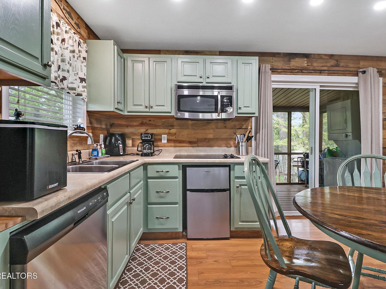 This charming kitchen corner features soft sage-green cabinetry paired with warm wood-paneled walls, creating a cottage-inspired ambiance. Stainless steel appliances, including a compact fridge, microwave, and dishwasher, provide modern convenience while blending seamlessly with the rustic elements. The beige countertop wraps around in an L-shape, optimizing preparation space next to the double sink beneath a window dressed in nature-themed curtains. A round wooden dining table with matching chairs painted in muted green extends from the kitchen, inviting casual meals. Sliding glass doors reveal a screened porch and a laundry area, enhancing the home’s functional and cozy rural feel.