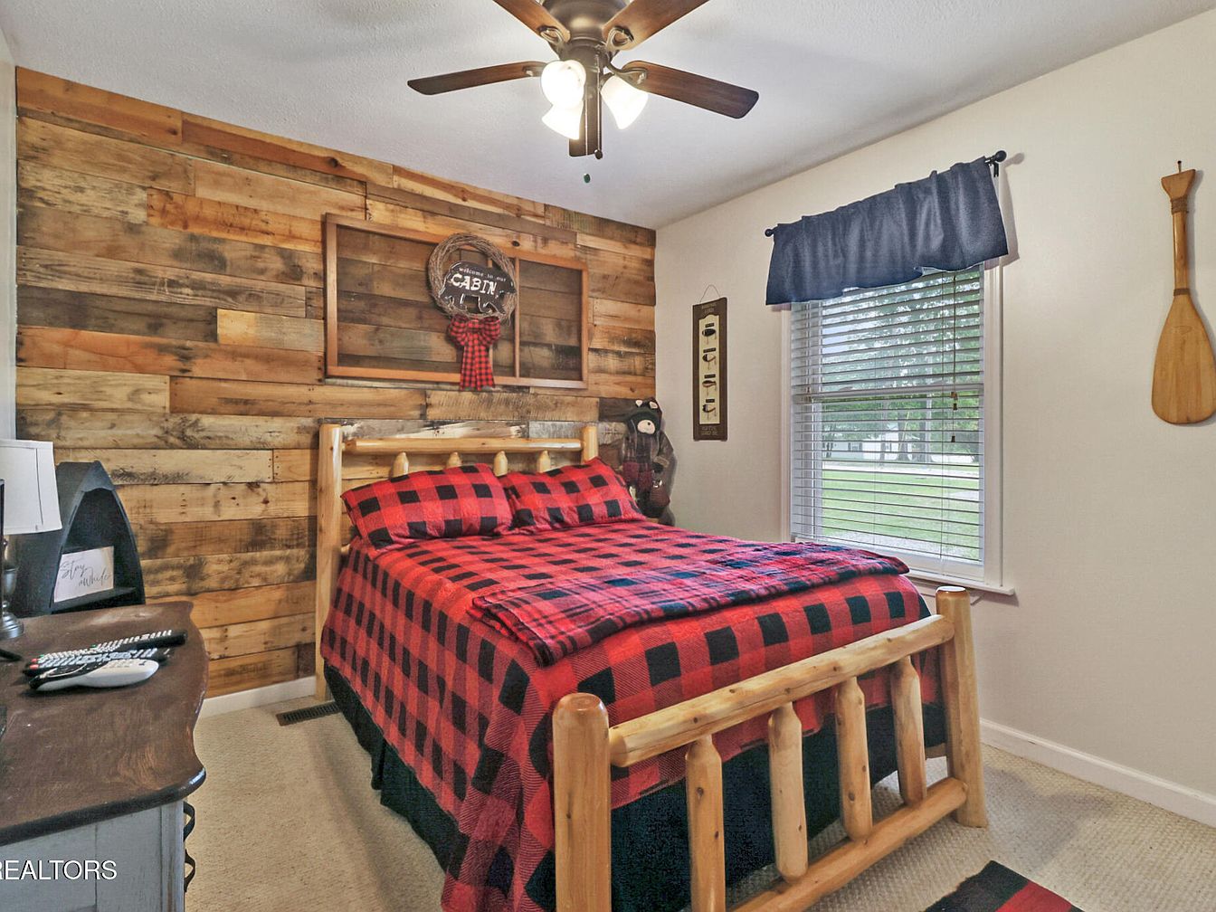 This inviting bedroom features a charming rustic cabin theme, centered around a natural wood log bed frame. The standout element is the wood plank accent wall behind the bed, adding warm textures and a natural tone contrast to the otherwise neutral walls. The bed is dressed in red and black buffalo plaid bedding, enhancing the cozy, lodge-like ambiance. A ceiling fan with lights offers practical illumination and air circulation. Near the window, a dark valance complements the plaid accents while woodland-themed decor, including a paddled wall hanging, adds to the outdoorsy, homey feel of the space.
