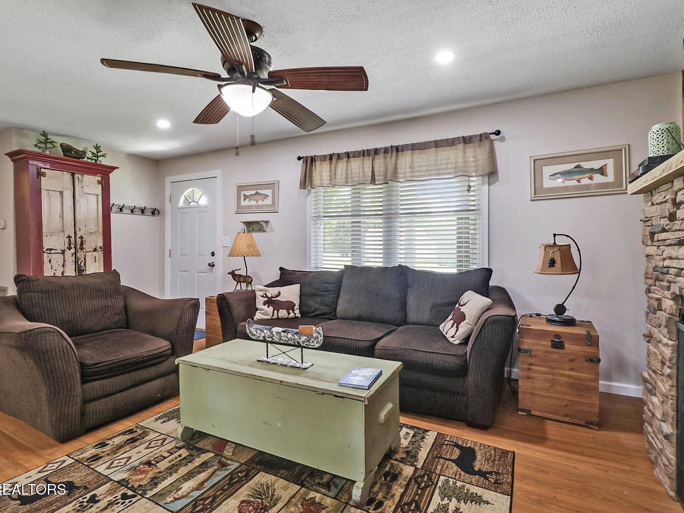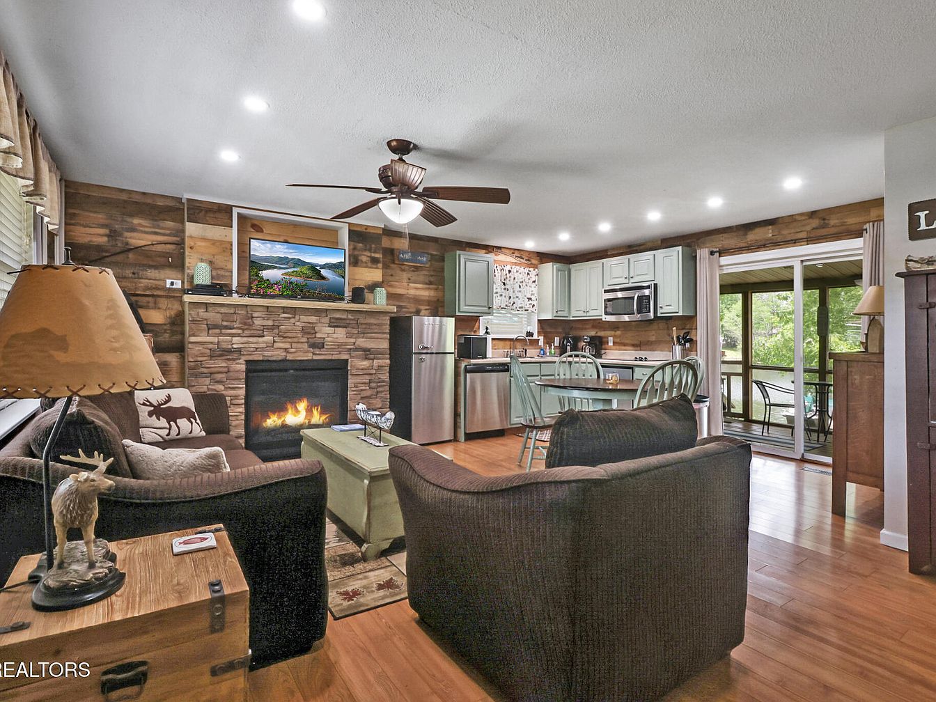 This cozy living space blends rustic charm with contemporary functionality. A stone fireplace with a mounted TV above anchors the living area, flanked by wood-paneled walls in warm tones that enhance the inviting atmosphere. Dark cushioned sofas face the fireplace, accented with nature-themed pillows. A wooden side table with a moose figurine adds character. The kitchen is compact yet efficient, featuring pastel green cabinetry and stainless steel appliances including a microwave and a small fridge. Oak hardwood floors extend through the open layout. Large sliding glass doors open to a screened porch, inviting natural light and greenery indoors. Recessed ceiling lights and a ceiling fan complete the room’s comfortable, homey vibe.