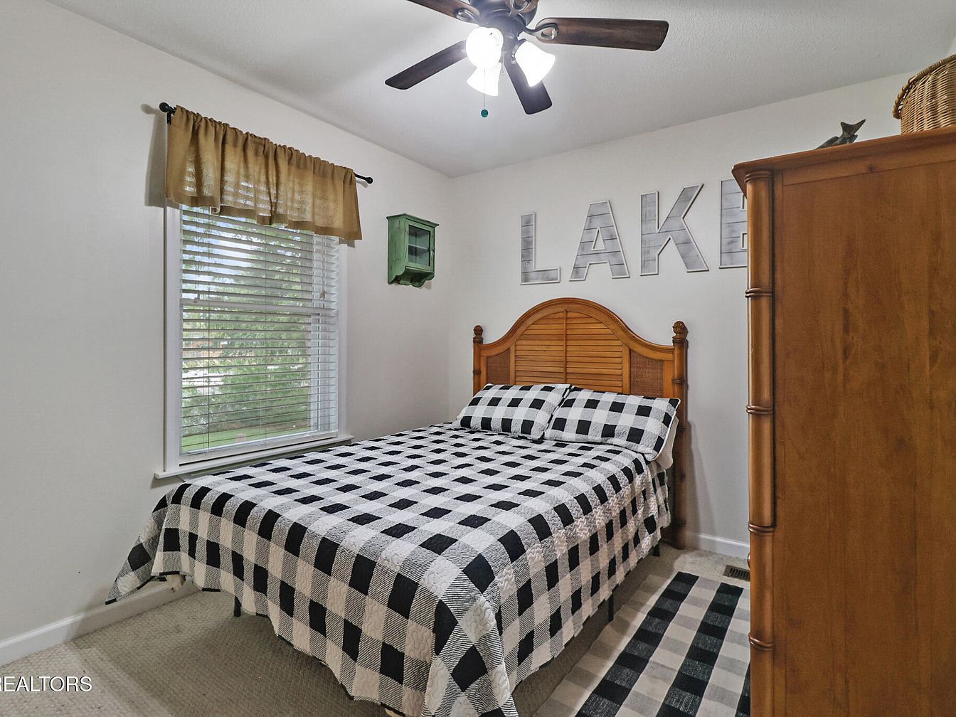 This bedroom features a warm and inviting layout with a wooden bed frame that includes a shutter-style headboard. The bed is dressed in a black-and-white buffalo check quilt and matching pillows, continuing onto a coordinating striped area rug below. The walls are painted a clean white, creating a bright, airy feel, which contrasts nicely with the natural wood tones of the large dresser. A single window with white blinds and a brown valance allows soft daylight to filter in. Decorative metal letters spelling “LAKE” above the bed add a rustic, personal touch. A ceiling fan with dark wooden blades provides functional lighting and air circulation.