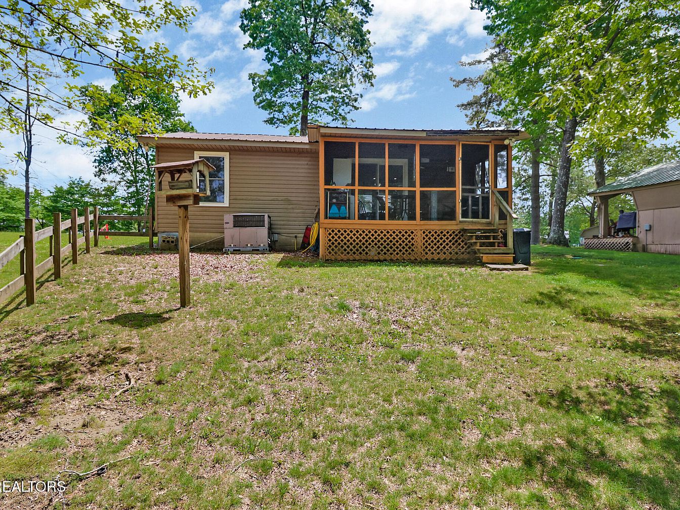 This tranquil backyard features a screened porch attached to the rear of the house, providing a versatile outdoor living space that blends comfort with nature. The porch boasts wooden framing with large screen panels, allowing for unobstructed views while keeping insects at bay. Steps lead down to a grassy yard that is expansive yet informal, bordered by a simple wooden fence on one side. Mature trees provide dappled shade and enhance the peaceful, natural setting. A bird feeder stands nearby, adding a charming touch. The home’s exterior siding is a neutral tan, complementing the earthy tones of the yard and wood accents.