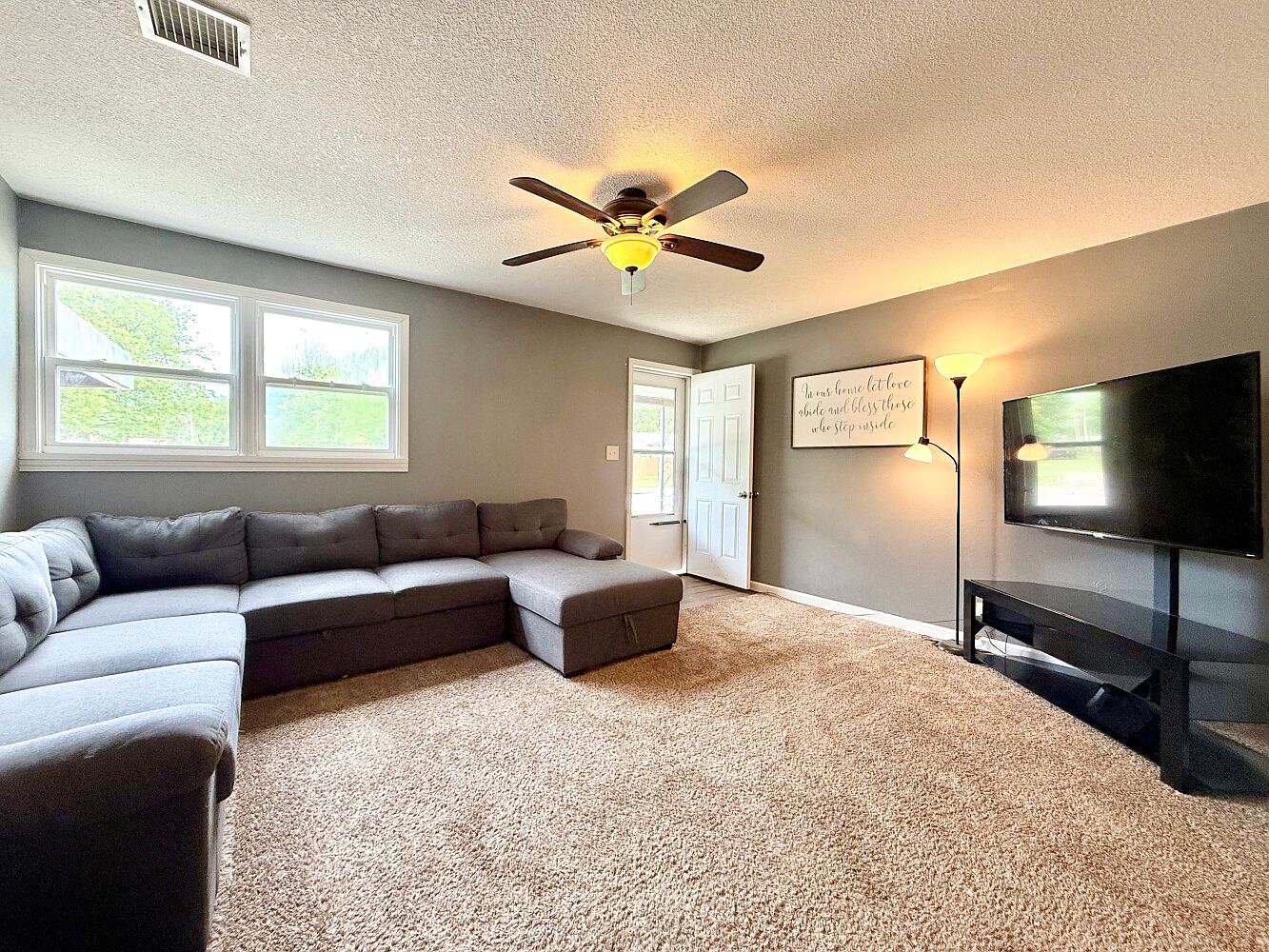 This inviting living room features a spacious gray sectional sofa arranged to maximize comfort and social interaction. Walls are painted a soft, neutral gray, enhancing the natural light streaming in through a set of triple windows. The plush beige carpet adds warmth to the space, while a black television sits on a sleek black stand, providing a modern contrast. A ceiling fan with dark blades hangs centrally from the white textured ceiling, complementing the standing lamp nearby that softly illuminates the room. The white door opens to a bright exterior, contributing to the room’s airy feel. A charming wall sign adds a personal, welcoming touch to the aesthetic.