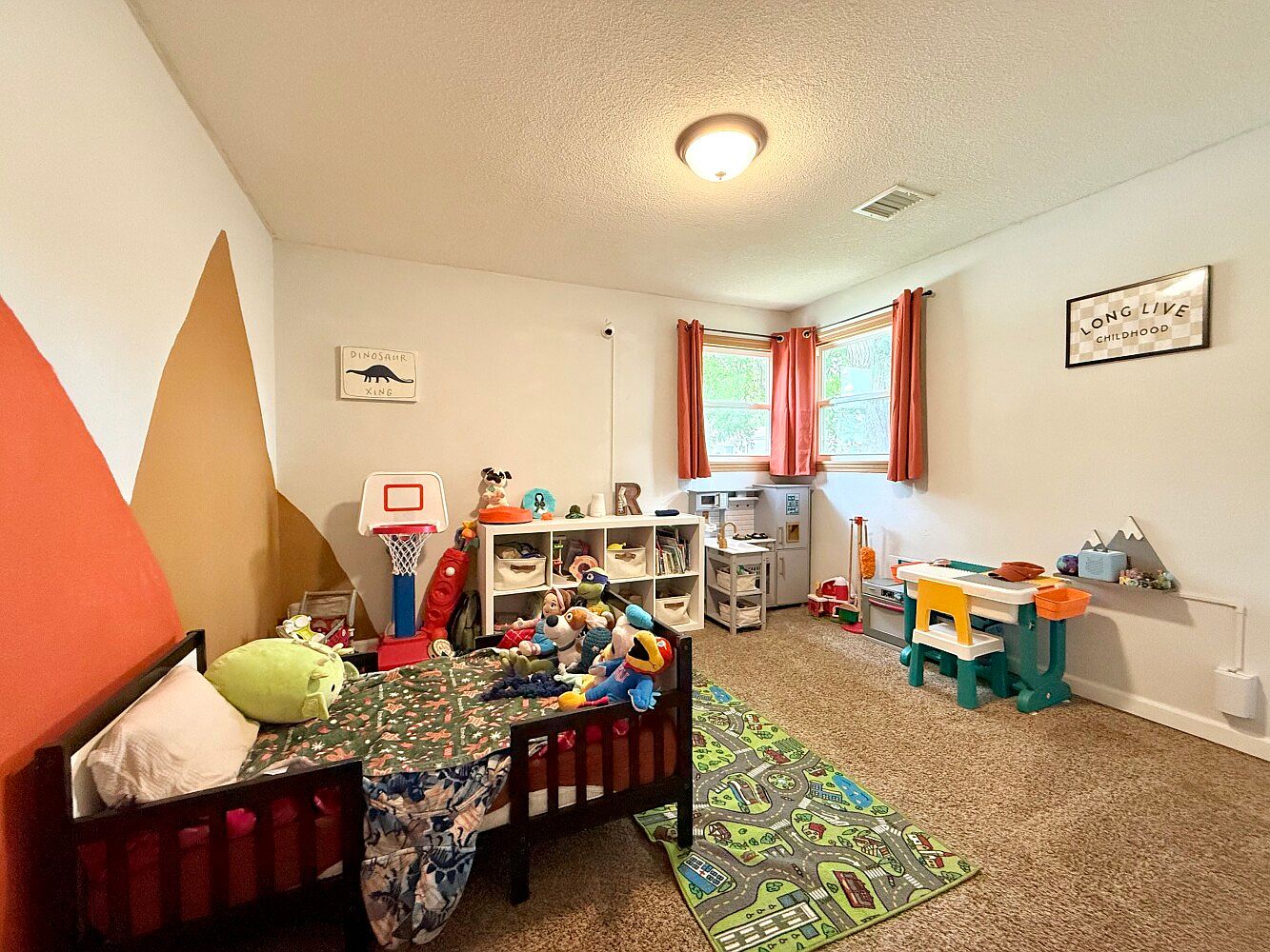This cozy children’s room features a playful and warm atmosphere with earth-toned accent walls in rust and tan that create a fun backdrop. A small dark-wood toddler bed is covered with a floral-patterned blanket and plush toys, emphasizing comfort and familiarity. The beige carpet adds softness underfoot. Organized storage units hold an array of toys and books, while a small play kitchen and table with colorful chairs occupy the corner, fostering creativity and play. Two windows dressed with burnt orange curtains fill the space with natural light. Wall art with cheerful messages enhances the inviting, family-friendly vibe.