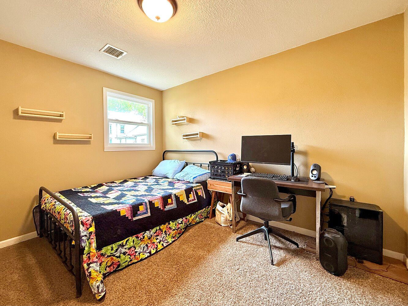 This cozy bedroom corner combines rest and productivity in a compact layout. Soft beige walls and neutral-toned carpet create a warm, inviting ambiance. The black metal bed frame is dressed in a colorful patchwork quilt and floral bed skirt, adding a touch of artisanal charm. A single window floods the room with natural light, enhancing the soft yellow wall tones. Minimalist wooden shelves are mounted above the bed, offering space for decor or essentials. Adjacent to the bed, a simple wooden desk hosts a modern computer setup with speakers, and a gray swivel chair completes the functional, yet comfortable workspace.