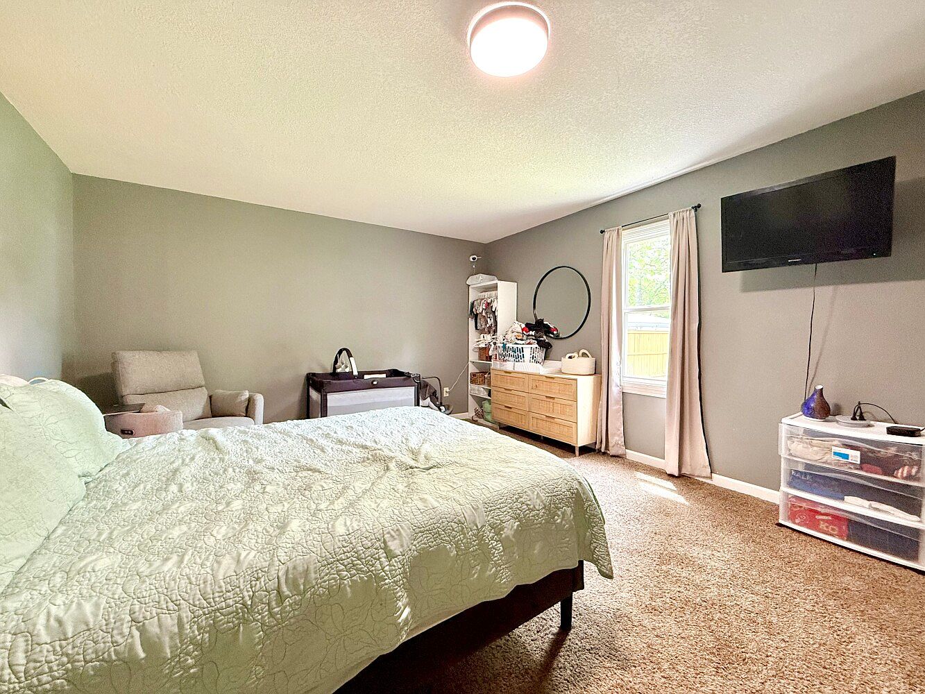 This bedroom features a calming and neutral color palette with soft grey walls contrasting against beige carpeting. A large bed adorned with a light, textured quilt occupies the foreground, creating a cozy sleeping space. Along one wall, a wooden dresser with a woven drawer front is topped by a circular mirror and an assortment of personal items, adding warmth and character. Adjacent to a window framed by light curtains is a mounted flat-screen TV, while a cushioned armchair and playpen are positioned in a corner, blending comfort and family functionality. The overall ambiance is relaxed and practical.