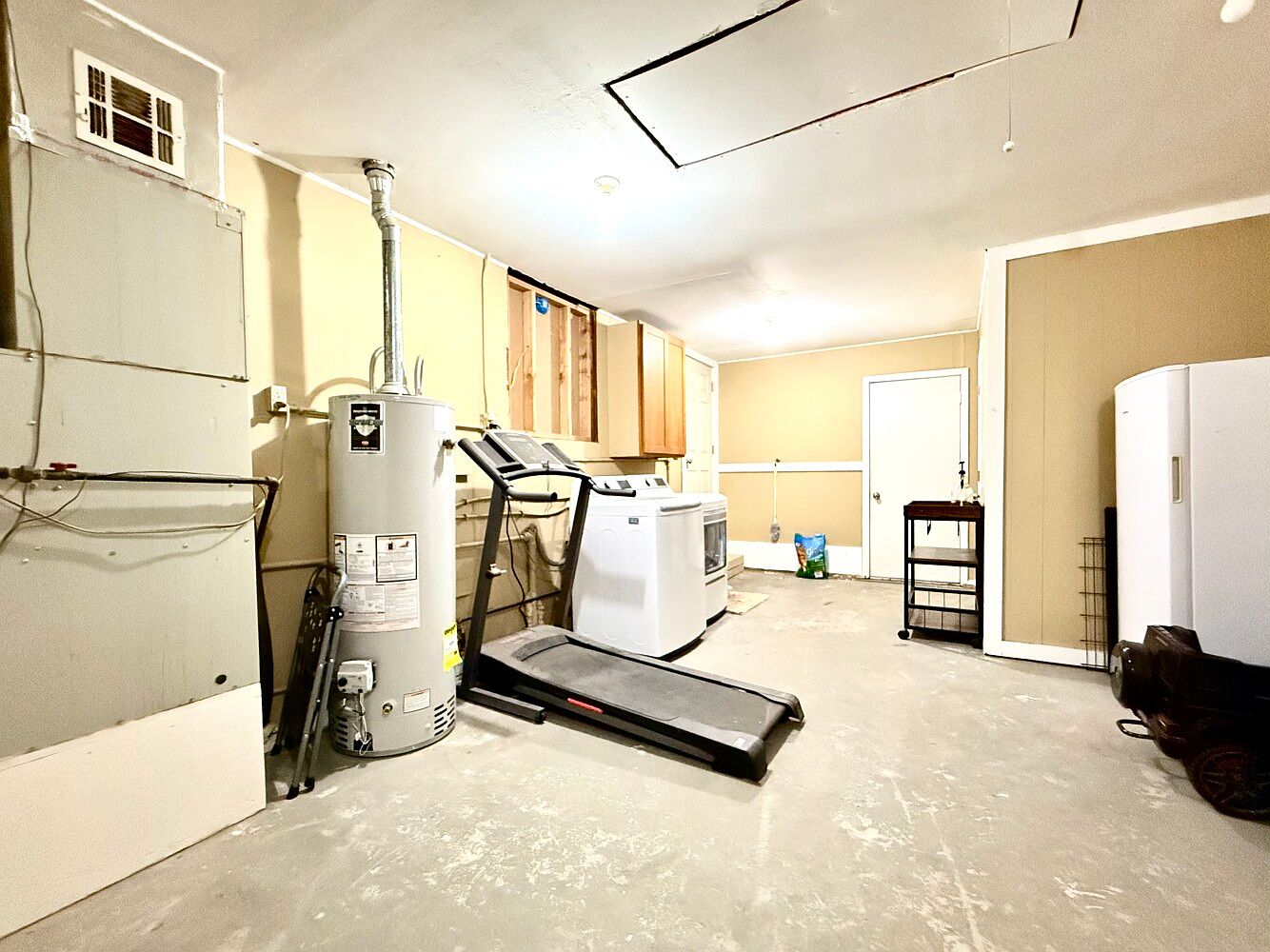 This spacious utility room combines laundry and utility functions with a neutral beige and white color palette, creating a practical, unembellished environment. The flooring is plain concrete, emphasizing its utilitarian nature. Against one wall, a washing machine and dryer sit side by side beneath wood cabinetry, offering functional storage. Nearby stands a water heater next to a treadmill, suggesting multipurpose use of the space. The walls feature simple paneling with white trim, and the ceiling includes an attic access panel. A white door at the far end provides access to an adjoining area, while a small, wheeled metal cart adds minor storage flexibility.
